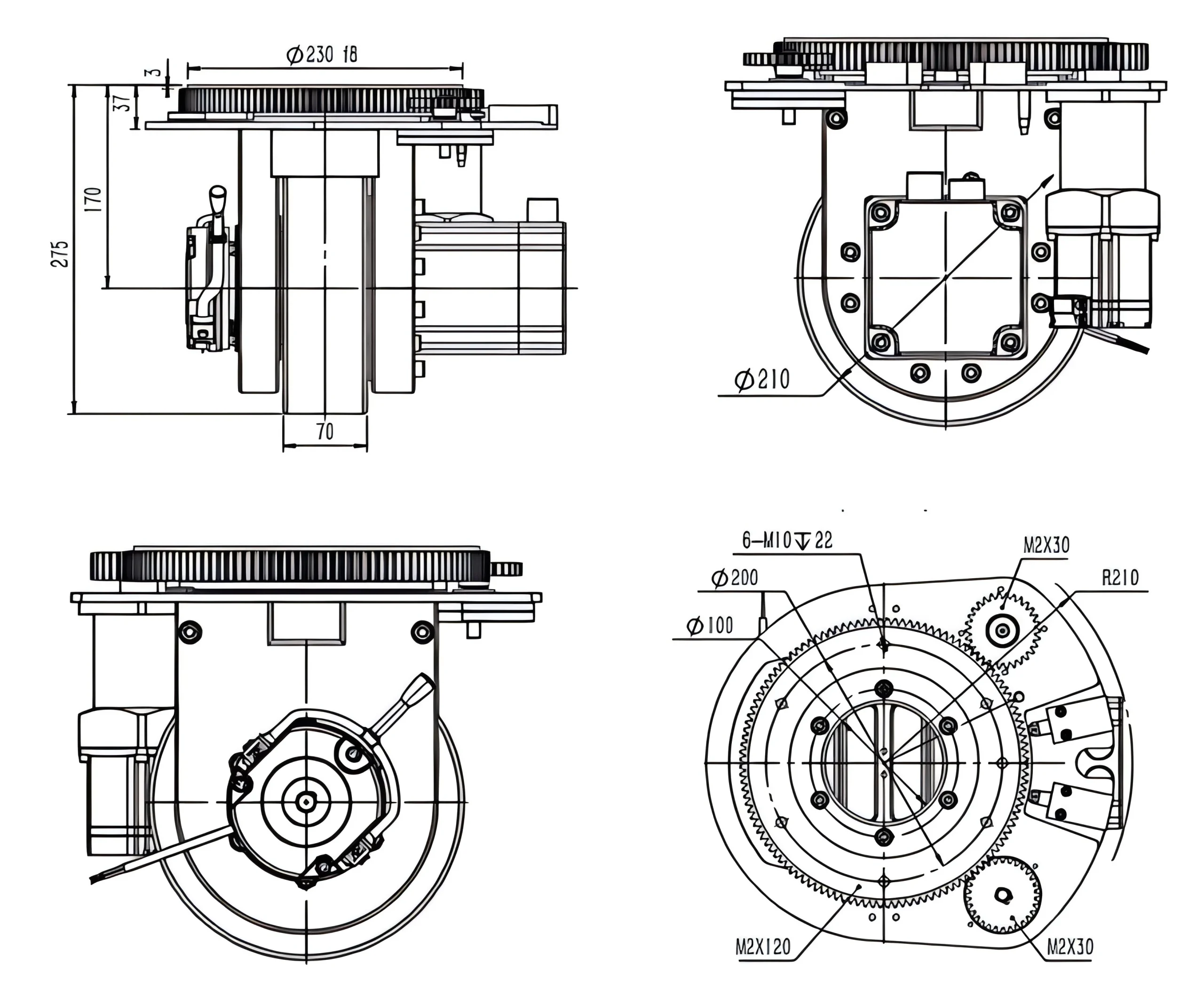 The steering system features a 400W motor with a rated torque of 1.27 Nm, operating at 48V DC, a rated current of 10.6A, and a motor speed of 3000rpm. With a gear ratio of 160, it provides high-precision steering control and a maximum turning speed of 112.5°/s, enhancing operational efficiency and navigation accuracy for the AGV steering drive wheel system. It incorporates an electronic limit angle of ±126° and a mechanical limit angle of ±135°, preventing oversteering and protecting the system from mechanical damage. A robust braking system further improves safety and stability during emergency stops or sudden maneuvers.