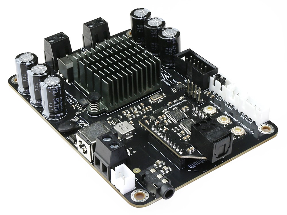 It’s a two channels amplifier board. It has an optical input connector on the board which can accept different sampling rates from digital audio sources, from 16bit 44.1KHz to 26bit 96KHz. The highlight point is the ADAU1701 DSP chip on board. Users can set each channel’s audio tones separately.