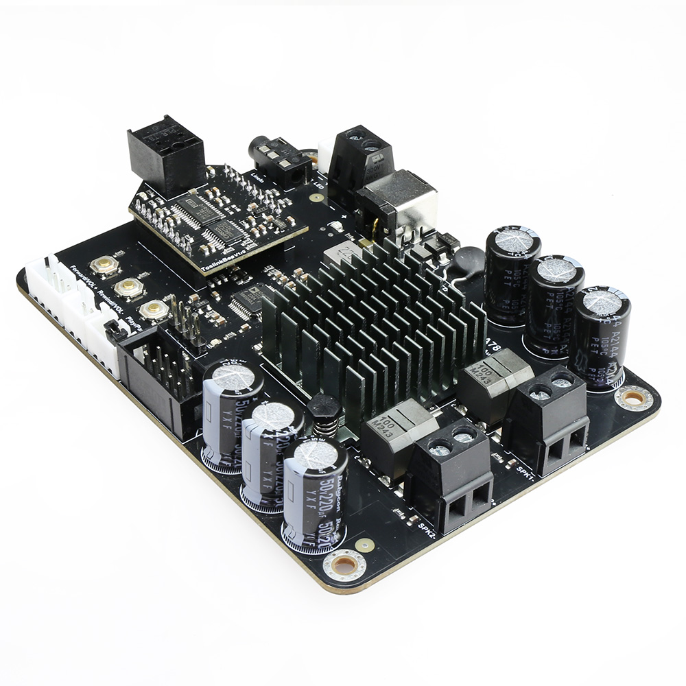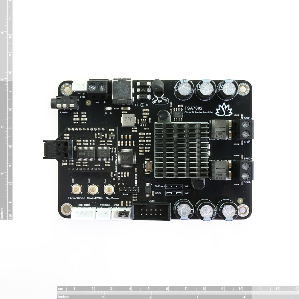 TSA7802D 2x50W 2 channels SPDIF+DSP digital amplifier board with a TOSLINKBee receiver module. TOSLINKBee converts the SPDIF optical signal to an I2S signal and outputs it to the ADAU1701 DSP chip. TSA7802D is a very flexible DSP/DAC/Amplifier combination board. It has perfect class-D architecture(Based on TPA3116D2), and two channels have a 50W power output. All the channels are capable of outputting nominal power simultaneously and continuously. Any DC12V-24V power supply can power this board. It can be used to drive any 4Ω or 8Ω passive speakers.