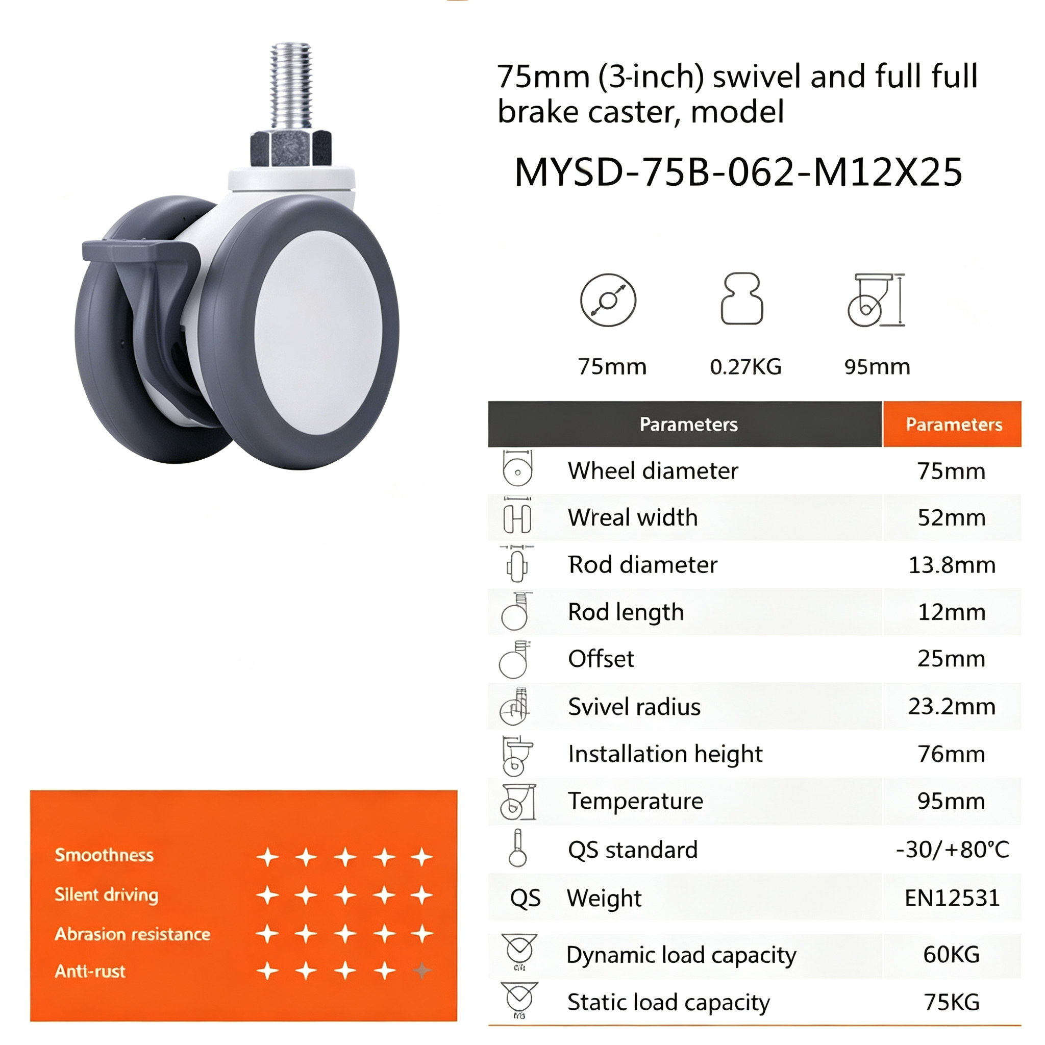 - Wheel Diameter: 75mm (3 inch)