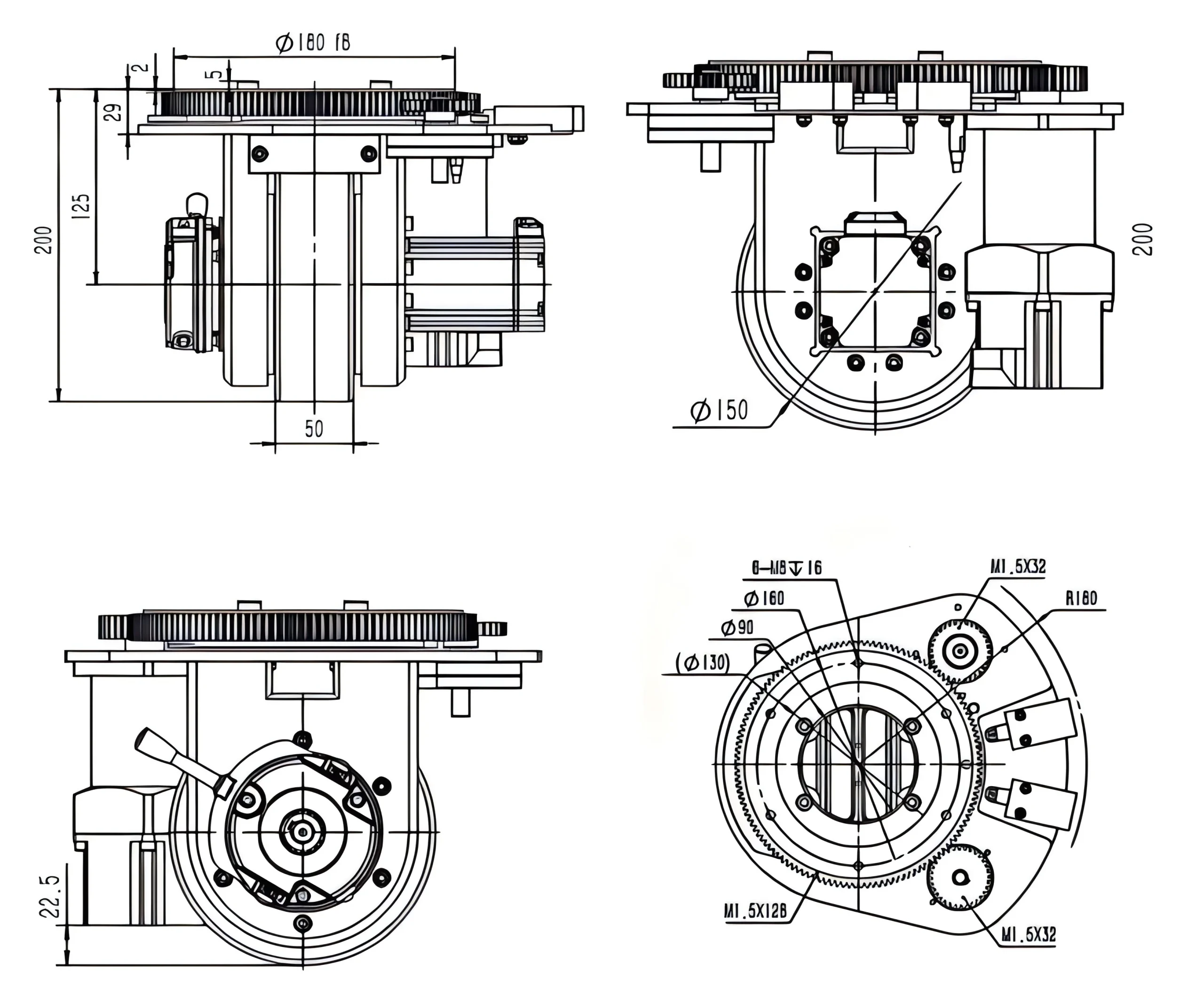 150mm drive wheel, maximum speed of 88.3m/min (other speed ratios are 67.3, 58.9, 50.5, 44.2m/min), load capacity of 400kg, turning radius of only 180mm, ensuring flexible operation of AGV robots in small spaces. The entire machine weighs 16kg, which reduces the overall weight of the AGV and improves the energy efficiency and operational flexibility of the AGV robots.