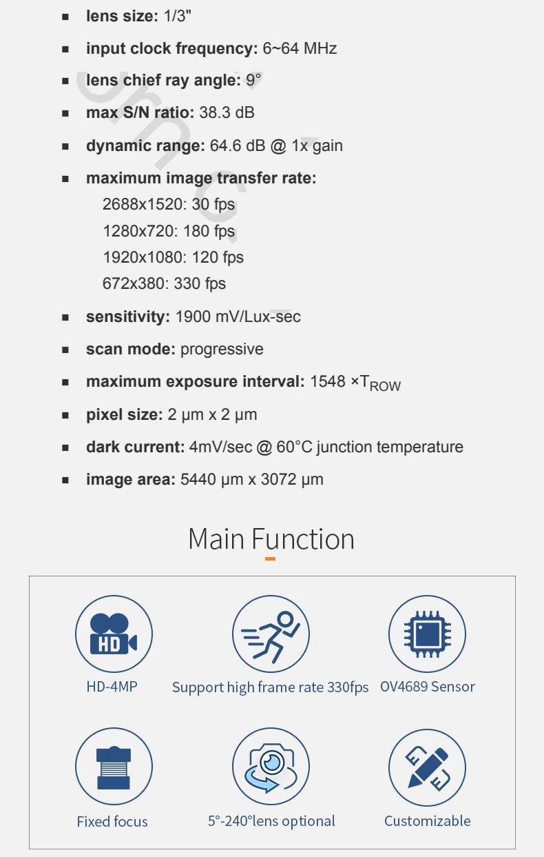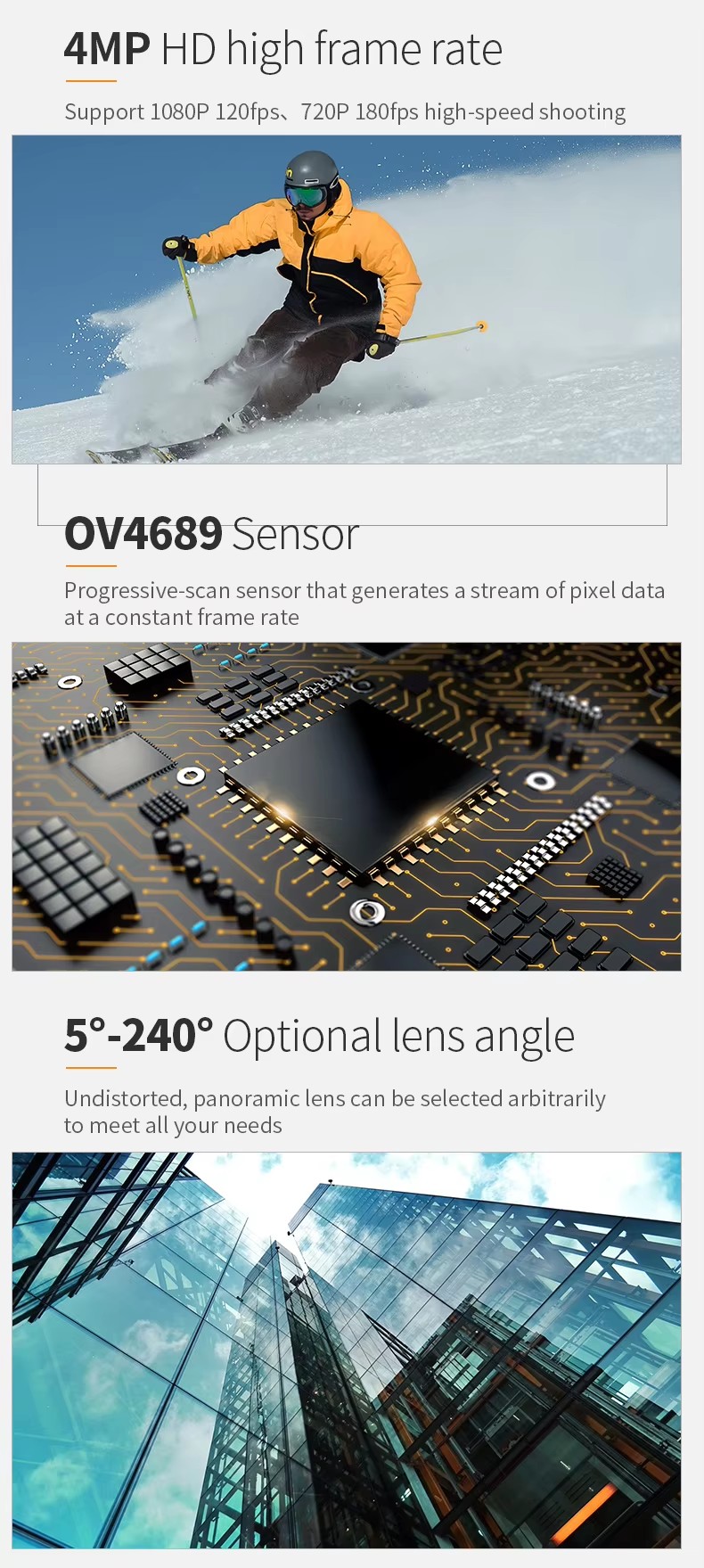 - Frame rate: 4MP:30fps 1080P:120fps 720P:180fps 672×380:330 fps