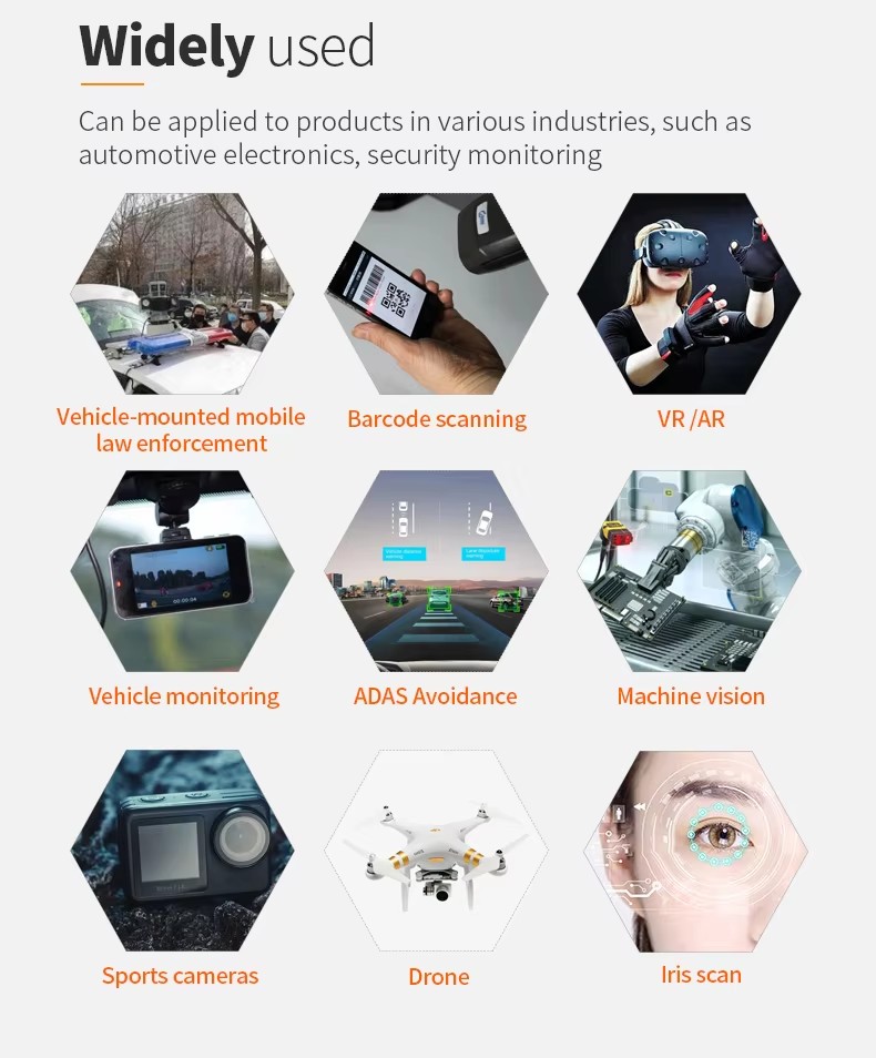 Machine vision, barcode scanning, automotive electronics, security monitoring systems, high-speed photography systems, sports DV, driving recorders, and police enforcement instruments.