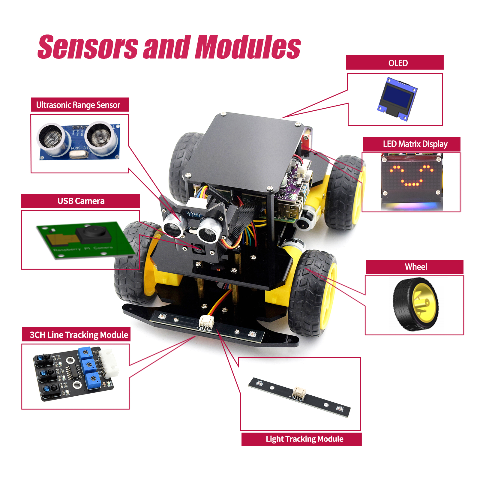 - 4WD(Four-wheel drive), each wheel can be driven independently. This Smart Car Kit is designed for students to learn coding, building, and robotics. Compatible with Raspberry Pi 5/4B/3B/3B+(Raspberry Pi NOT Included!).