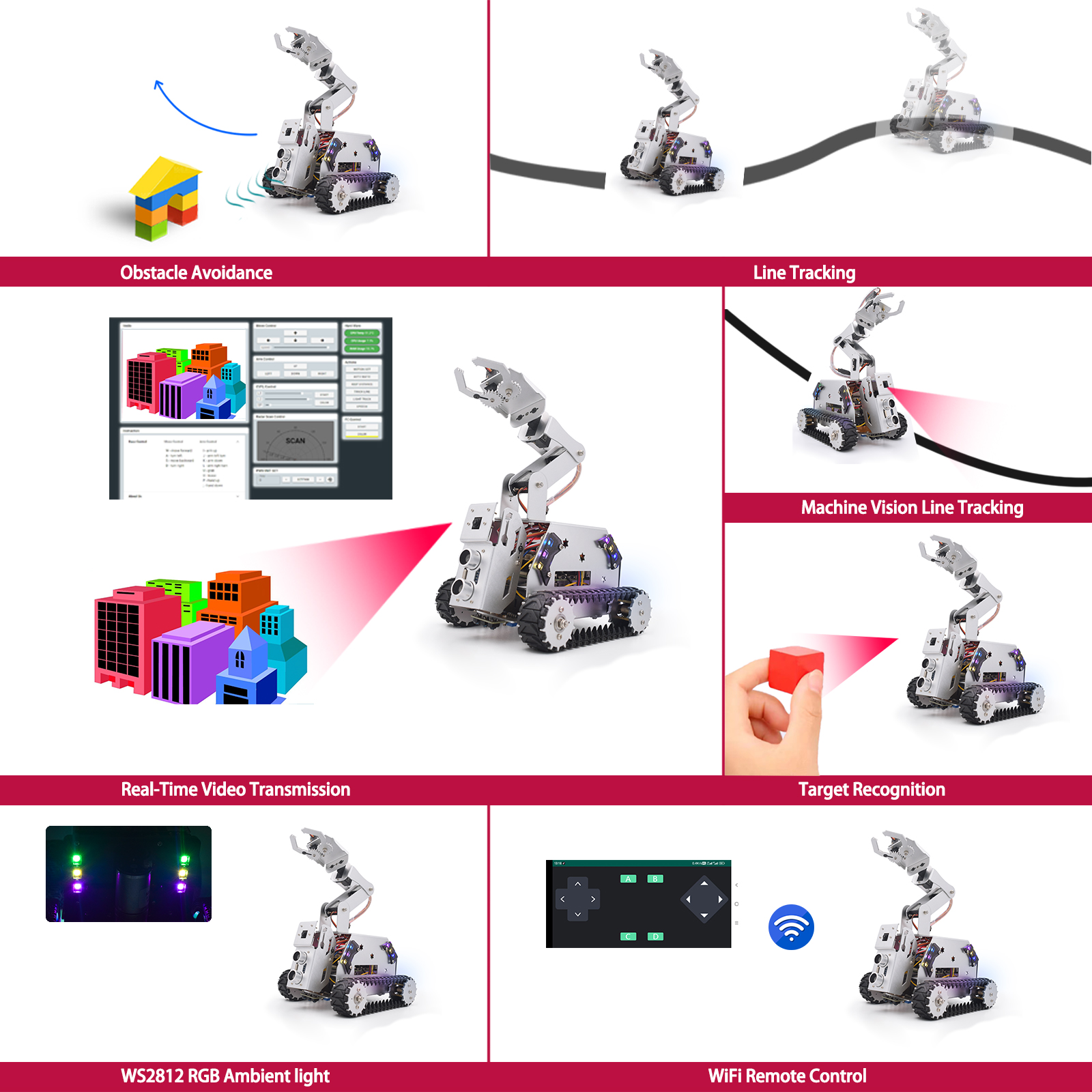 - Multiple Functions: Obstacle avoidance, Line tracking, Computer vision line tracking, Wi-Fi remote control, Target recognition, Real-time video transmission, RGB light.