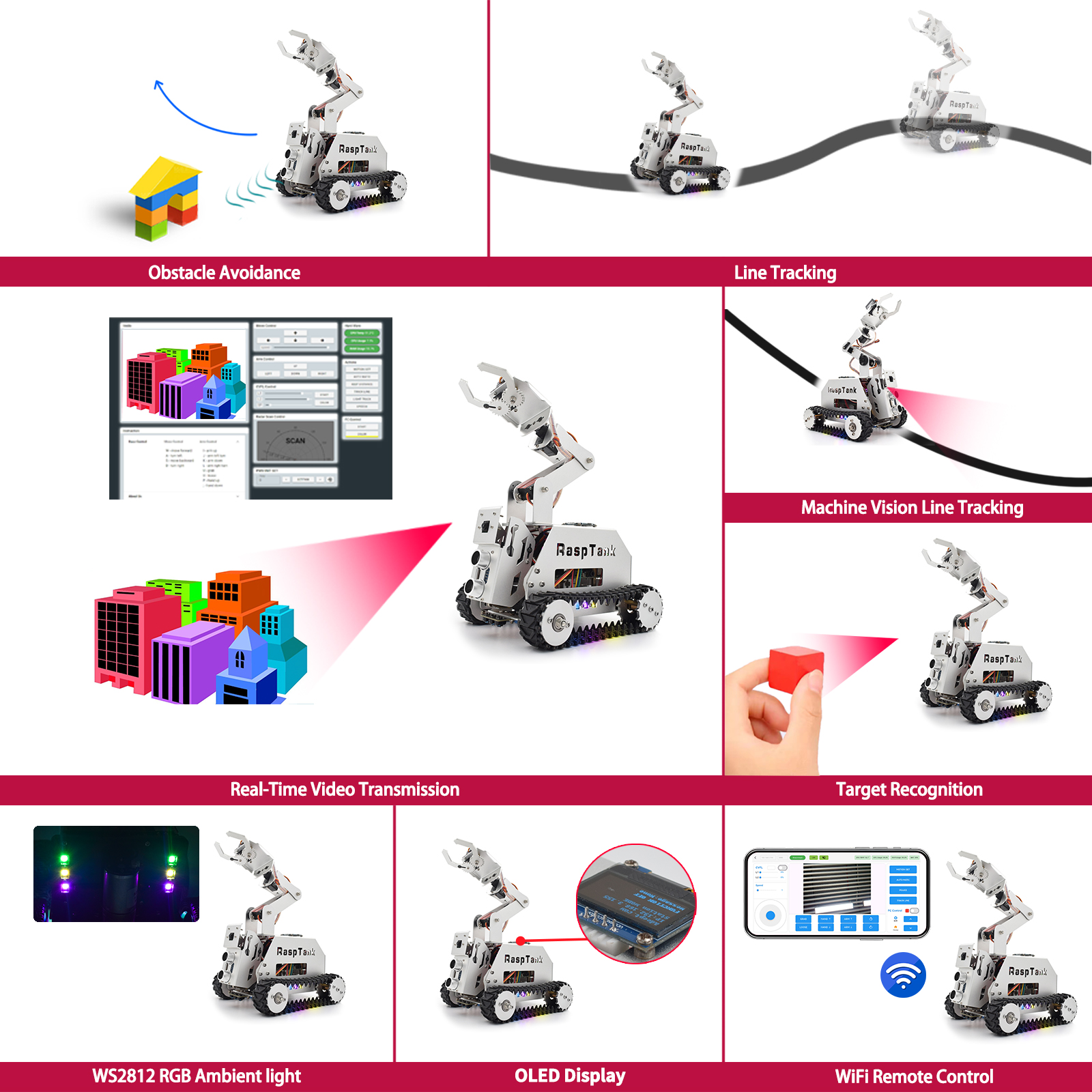 - Multiple Functions:Â Obstacle avoidance, Line tracking, OLED Display, Computer vision line tracking, Wi-Fi remote control, Target recognition, Real-time video transmission, RGB light.