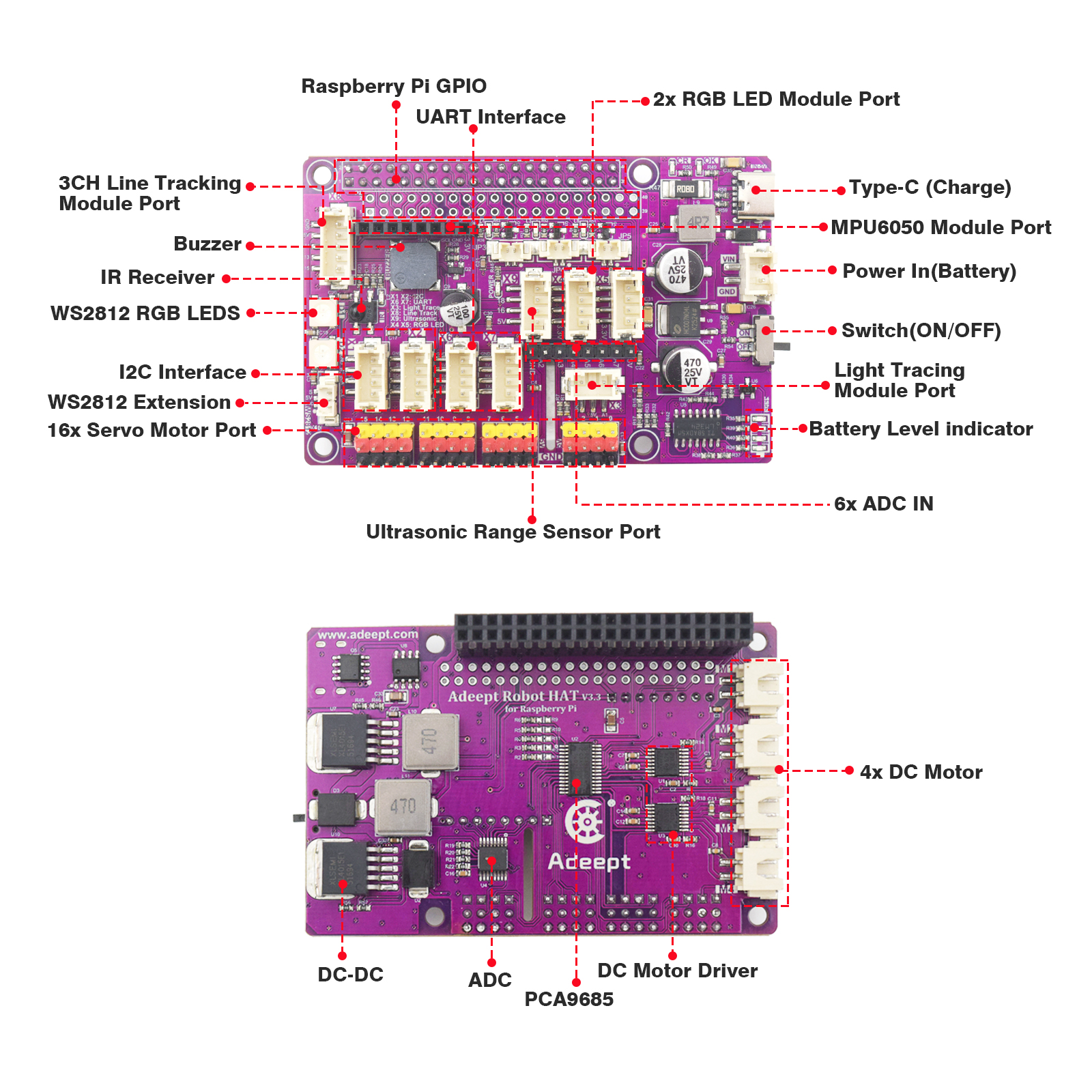 - Adeept Robot HAT V3.3(Motor driver board & Servo controller)