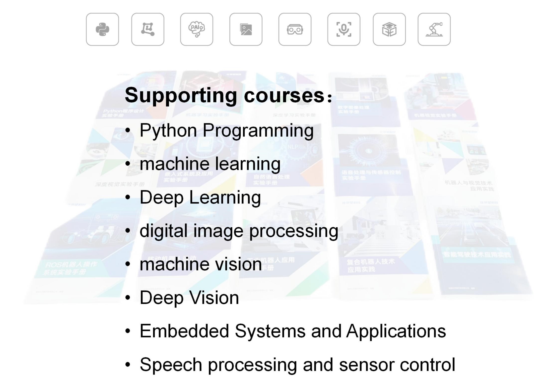 - Supports the teaching of courses or knowledge points in Python programming, machine learning, deep learning, digital image processing, computer vision, speech recognition, embedded systems and applications, intelligent robotics, and related areas.