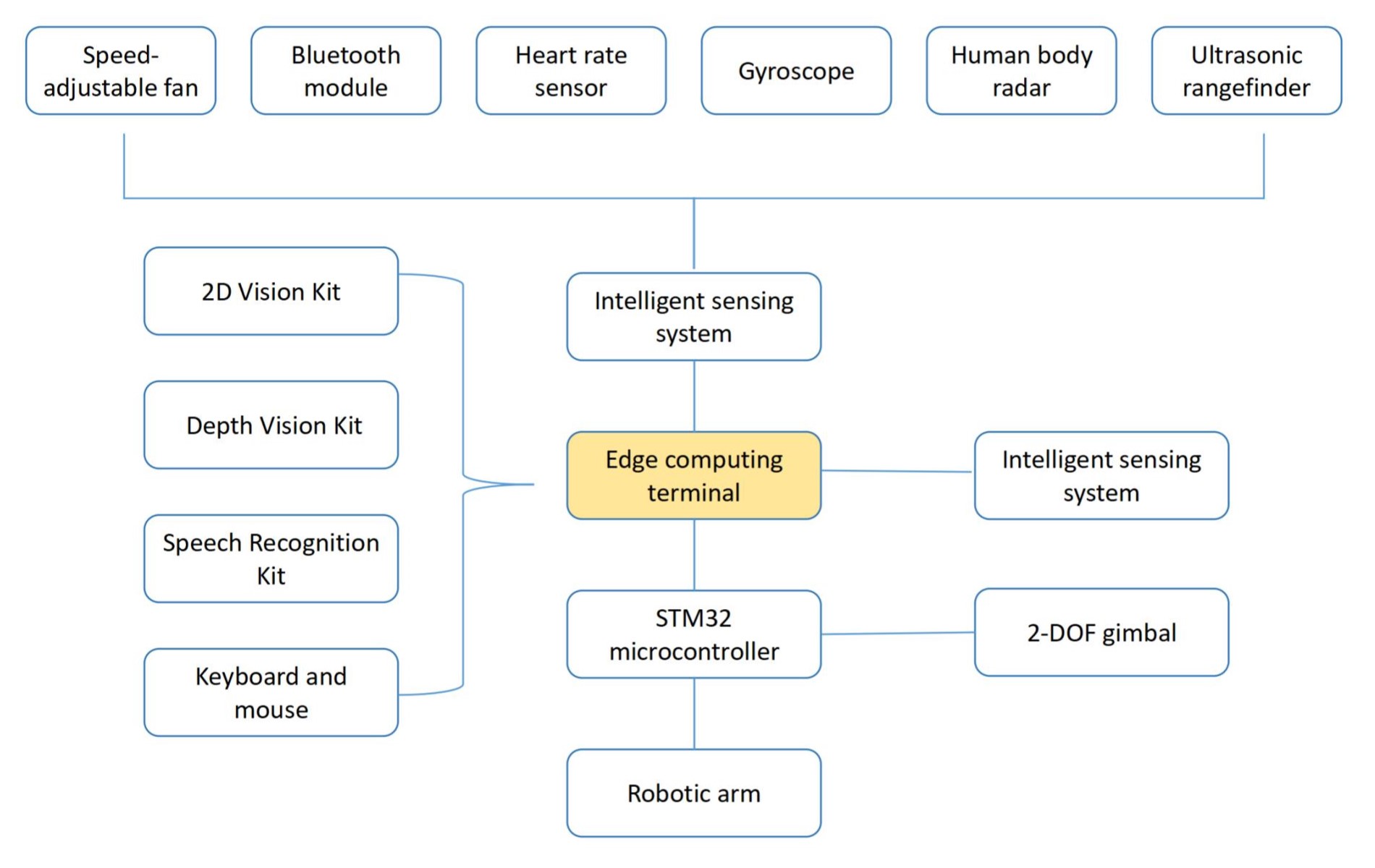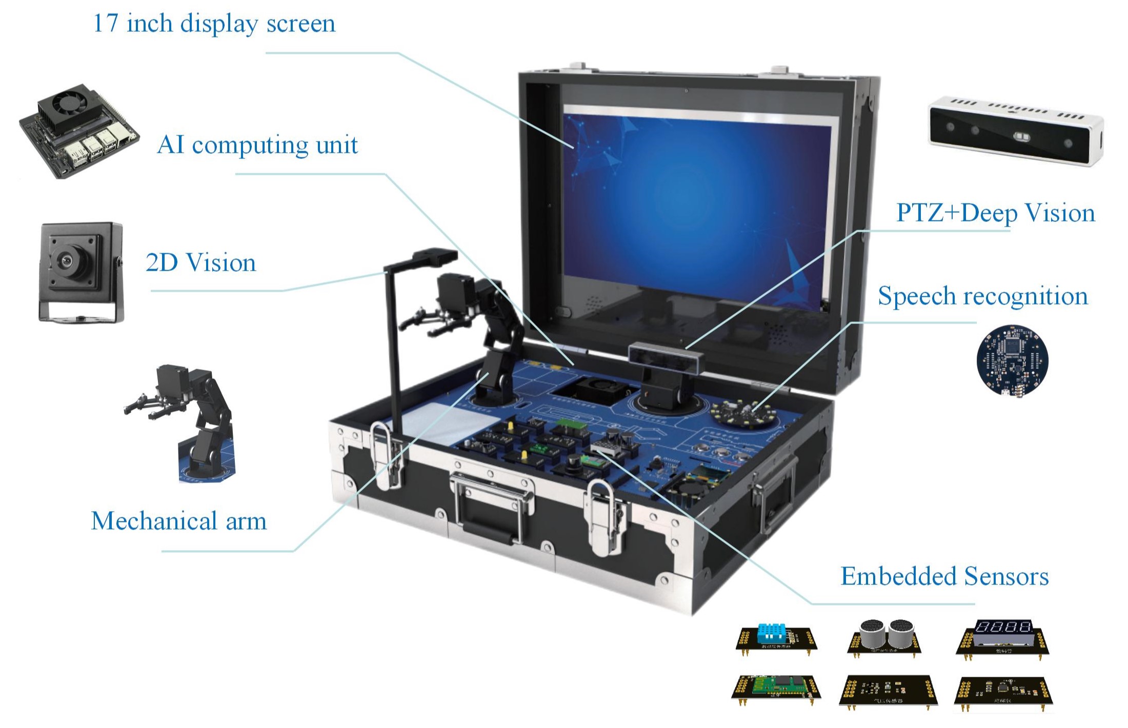The AI Experiment Box is designed for AI-related disciplines. It integrates various embedded application modules, including a computer vision system, a speech processing system, a robotic arm, a gesture sensor, a temperature and humidity sensor, and a barometric pressure sensor. Setting up an edge computing terminal provides a unified communication protocol and interface for AI-related application development. The experiment box runs Linux and uses Python to develop course resources, making it suitable for teaching and practical implementation in more than 8 AI-related courses.