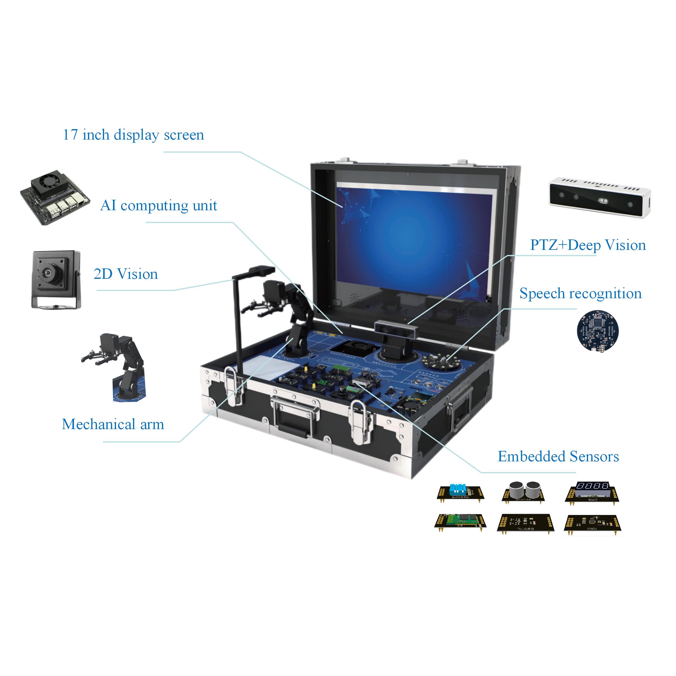 - Supports a variety of experimental combinations, including 2D vision + robotic arm, depth vision + PTZ, speech + sensors, speech + 2D/depth vision, and speech + robotic arm.