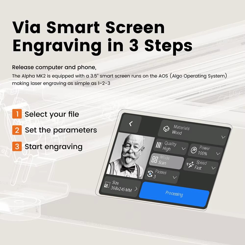 For beginners: The AlgoLaser app is a priority for simple logo and photo engraving.
