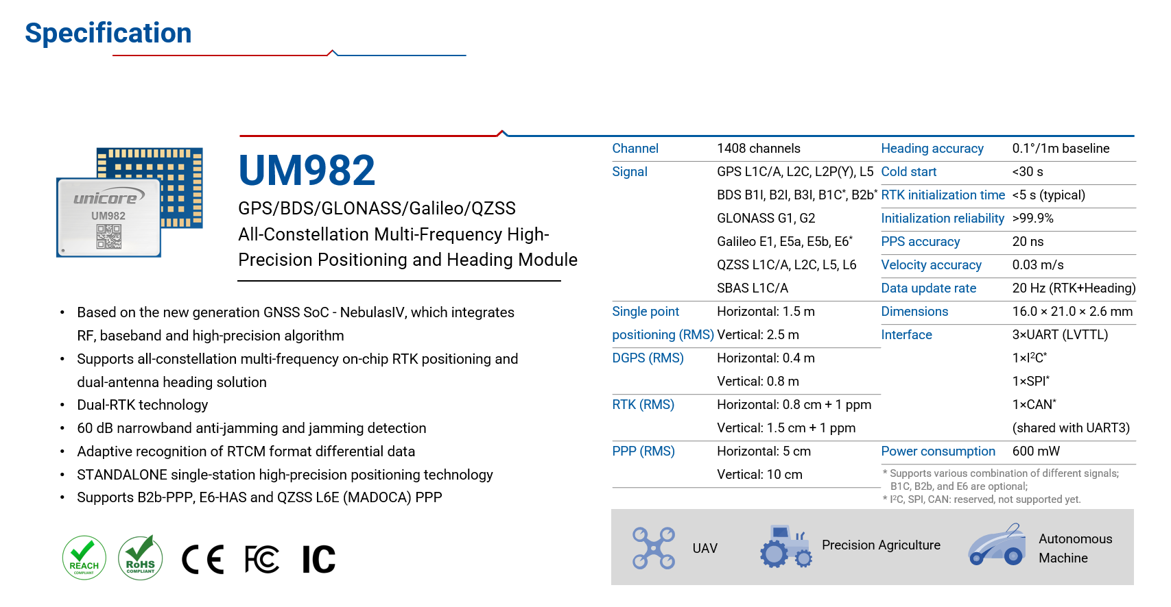 All-Constellation Multi-Frequency High-Precision Positioning Heading Processor UM982 for UAV and Autonomous Machines