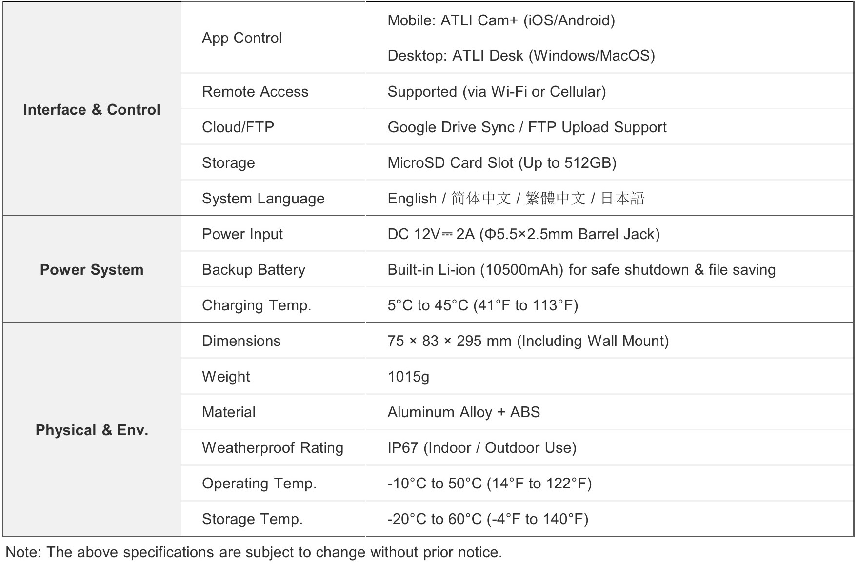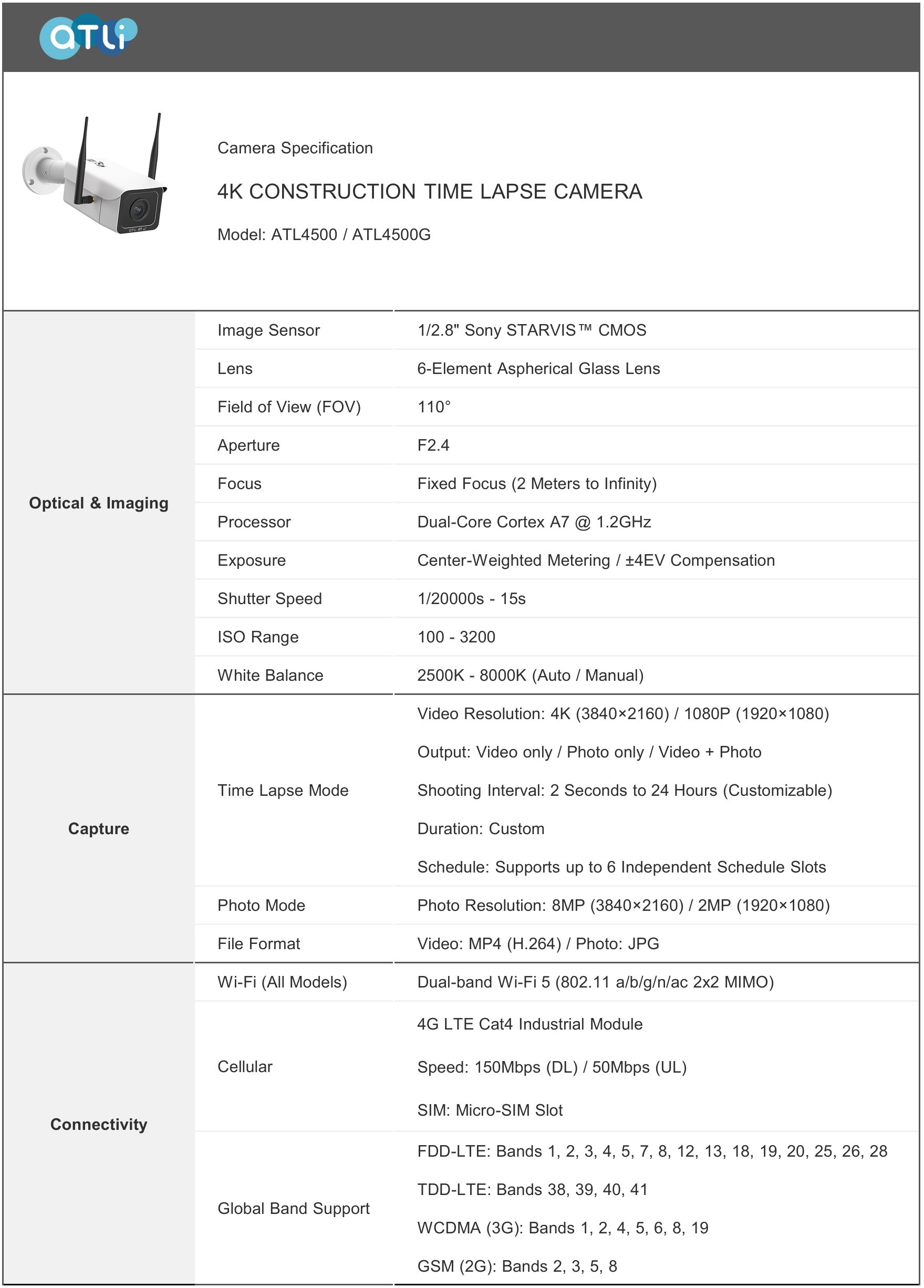 4K CONSTRUCTION TIME LAPSE CAMERA – Camera Specifications – Model: ATL4500 / ATL4500G