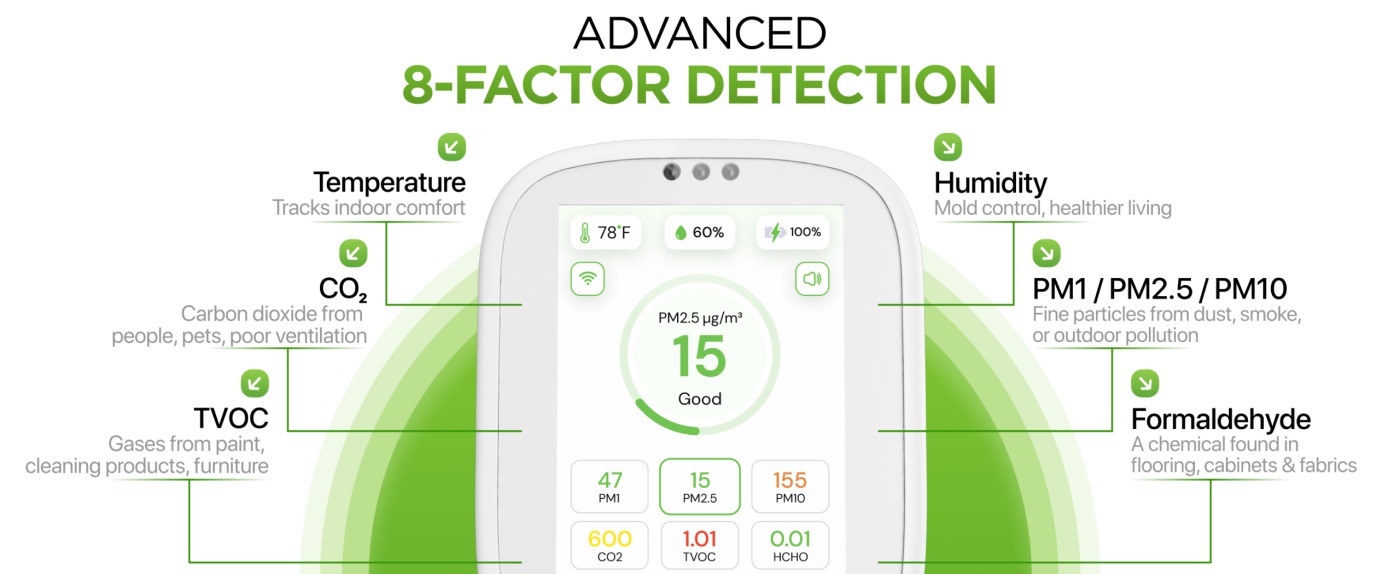 • Comprehensive 8-in-1 monitoring: PM1, PM2.5, PM10, CO₂, TVOC, HCHO, Temperature, and Humidity, your full indoor air snapshot in one device.