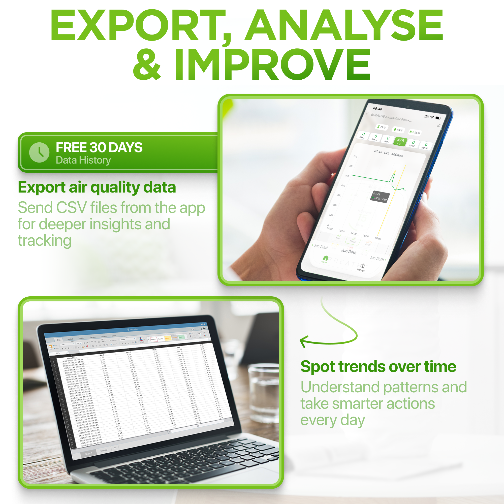 • Alerts: App notifications; optional on-device audible alarms for CO₂ & PM2.5.