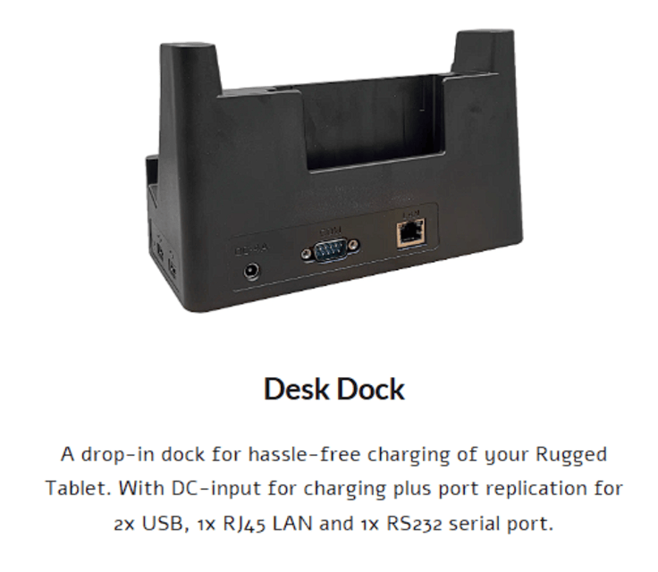 A drop-in dock for hassle-free charging of your Rugged Tablet. With DC-input for charging plus port replication for 2x USB, 1x RJ45 LAN, and 1x RS232 serial port.