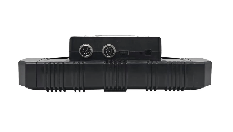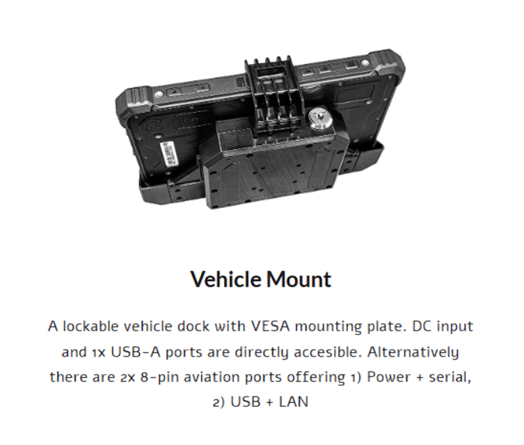 A lockable vehicle dock with a VESA mounting plate. The DC input and one USB-A port are directly accessible. Alternatively there are 2x 8-pin aviation ports offering 1) Power + serial, 2) USB + LAN