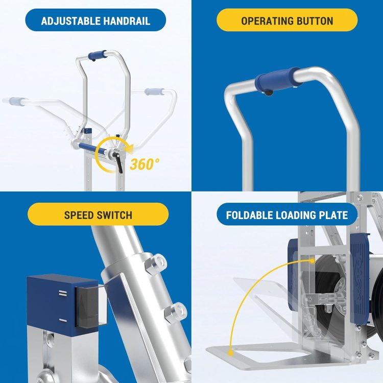 Easy to Operate Control—The XSTO motorized stair climbing trolley has a simple design of buttons. The operation switch is a point-touch design, making it easy to operate. The mode switch is for upstairs/downstairs, and the speed switch is for fast/slow. The handle is ergonomically designed, and the armrest is a foldable aluminum alloy. It can spin 360 degrees and adjust the angle on demand.