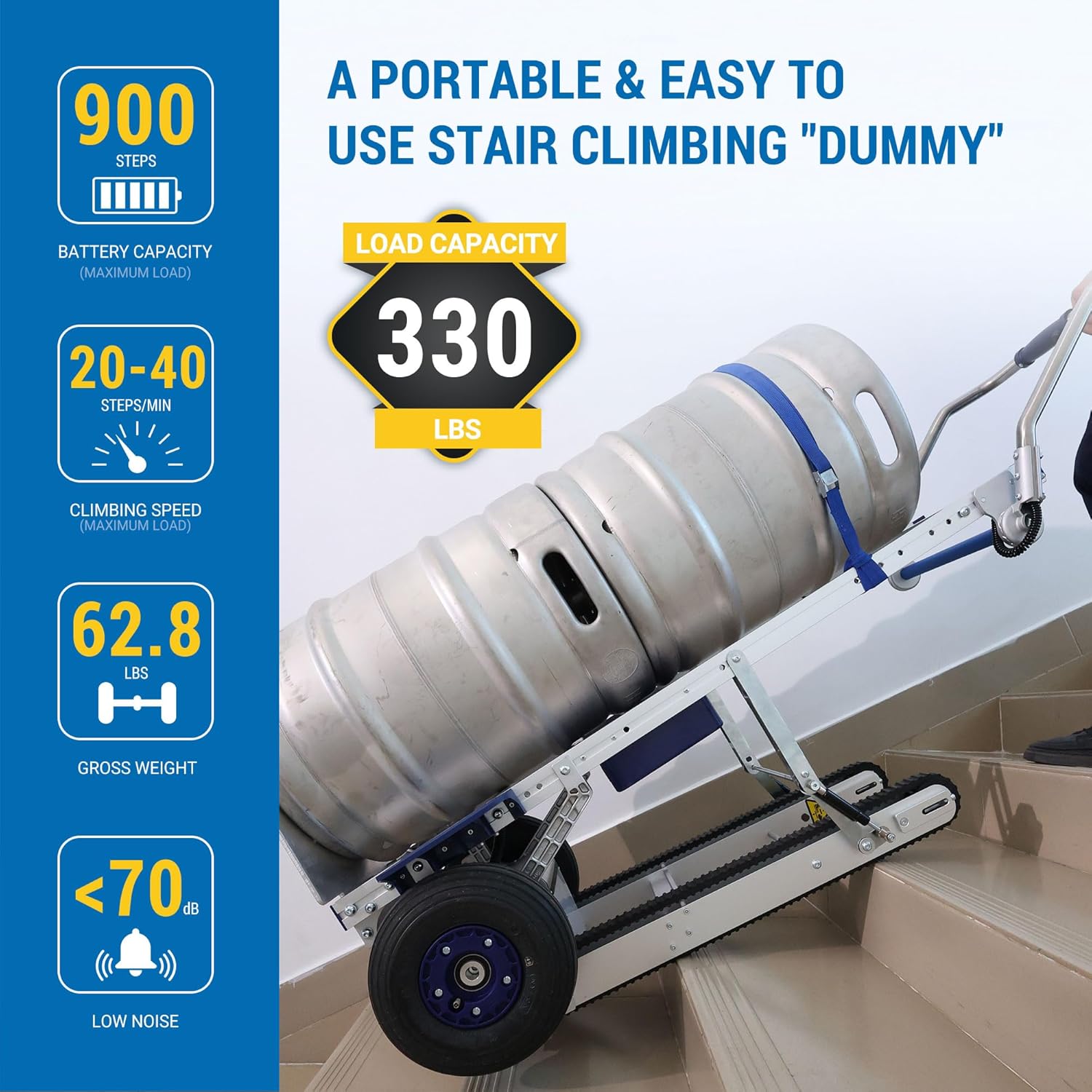 330Lbs Load Capacity—The XSTO stair climbing truck has a capacity of up to 330 lbs. It can easily carry printers, home appliances, furniture, and other goods by a single person. It can help you save huge labor costs. It comes with a 145.6-inch seat belt to help you secure the goods to prevent them from falling.