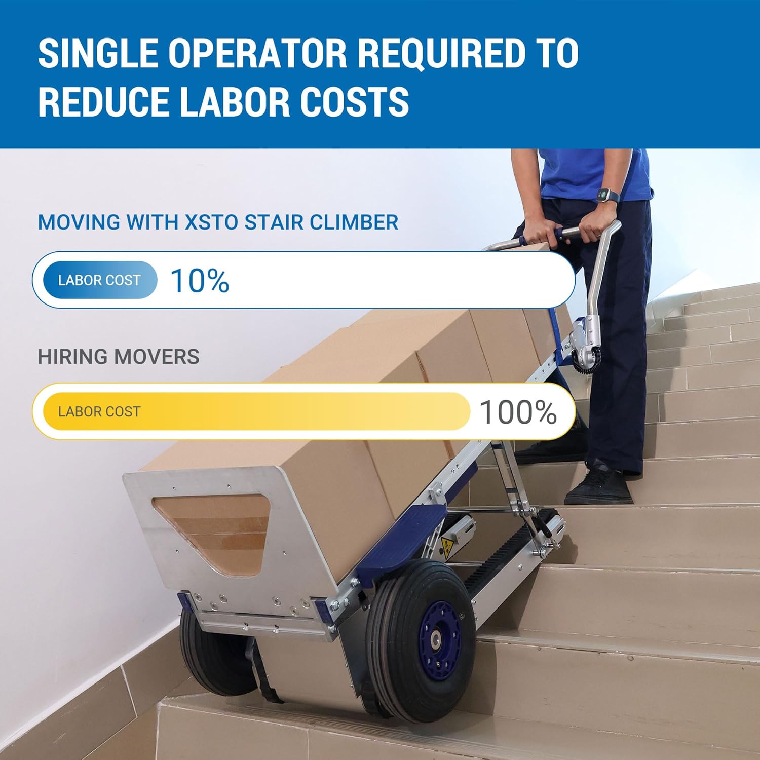 Labor-saving and Wide Applications—The XSTO heavy-duty stair climbing hand dolly allows you to maintain an upright posture on the stairs and control the goods transported. It is used by logistics, moving companies, and supermarkets. It is ideal for fridges, washing machines, furniture, wardrobes, cases, soft drink pallets, heavy packages, tools, etc.
