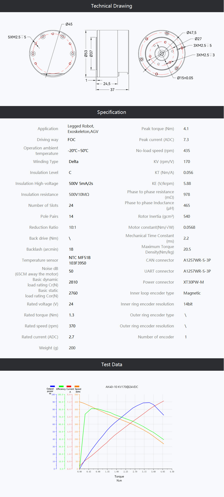 The AK40-10, AK45-10, and AK45-36 series are high-performance power modules that integrate a brushless motor, planetary gearbox, and driver into a single unit, providing an optimal solution for powerful motion and precise control. These modules feature a lightweight design with high efficiency and exceptional torque density, making them ideal for high-load applications. The gearbox’s core components and manufacturing process have been specially optimized to ensure ultra-smooth operation. Supporting both servo and motion control modes, they incorporate adaptive PID settings, eliminating complexity and enabling direct, hassle-free operation.