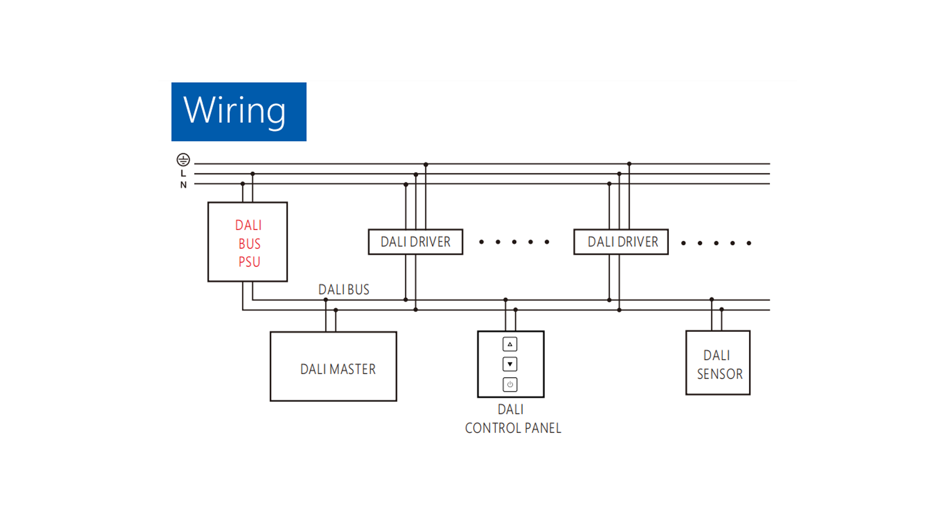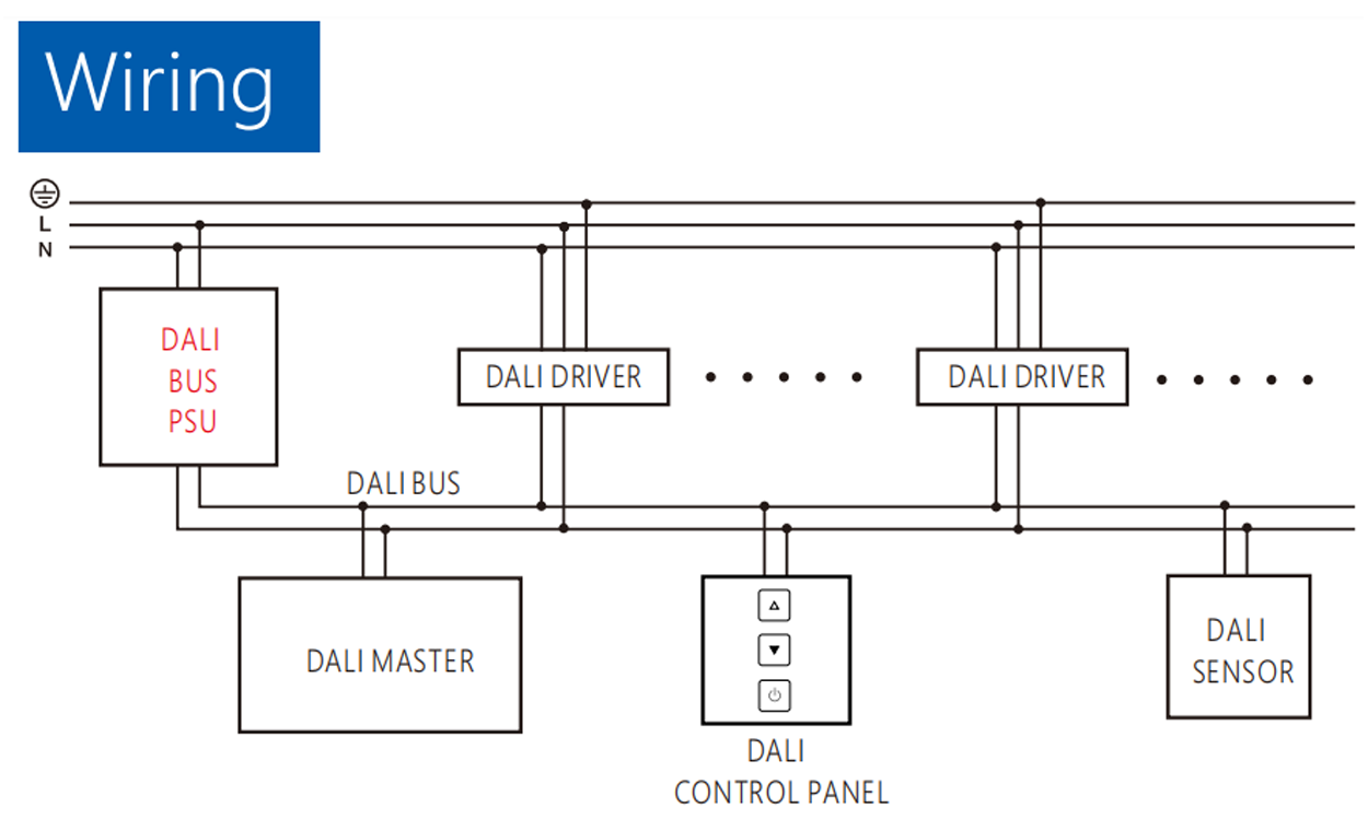 • It is used to supply power to multiple and various DALI devices, e.g., DALI LED driver, sensor, control panel, etc, a maximum of 64devices