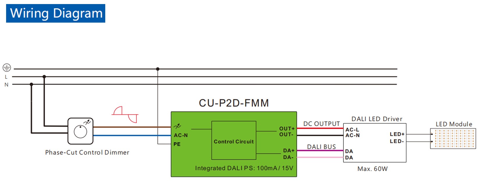 When using a DALI LED driver, if you want to control dimming with a phase-cut dimmer, this DALI converter is designed to translate the Triac/phase-cut dimming signal into a DALI broadcast command.