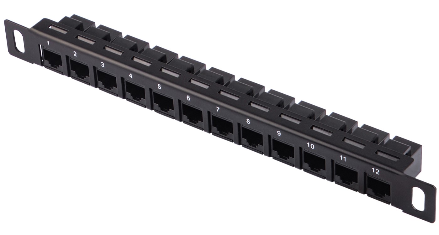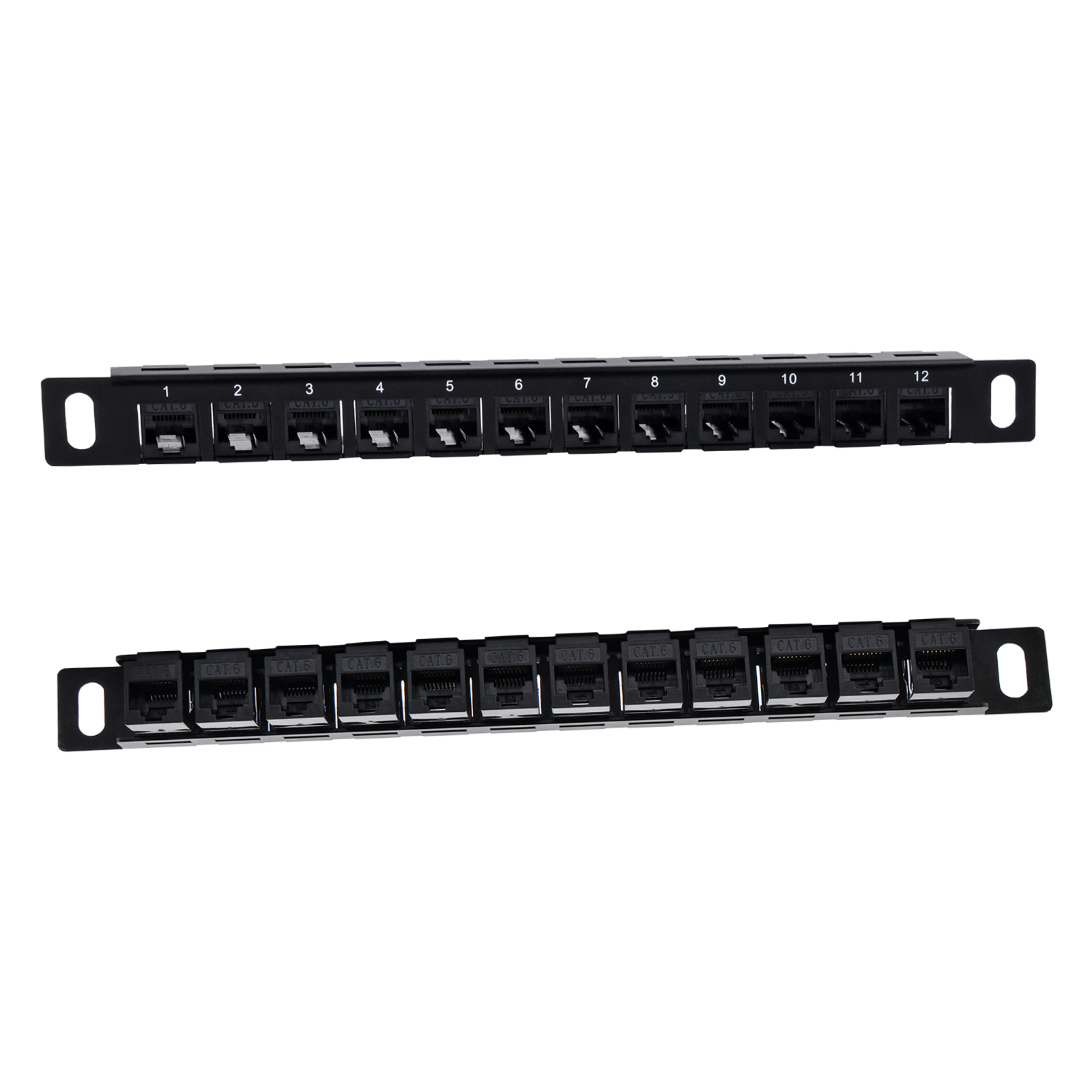 - 12-port Cat6 pass-through patch panel for easy cable connection without drilling holes.