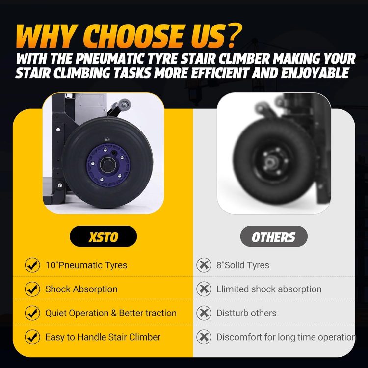• 10”PNEUMATIC TIRES & SUPPORT WHEELS: This electric stair climbing hand truck is equipped with pneumatic tires that can reduce vibration during climbing stairs and on flat ground, protecting goods and making operation more comfortable, protecting stairs and floors from wearing and scratching. The high-abrasive and anti-slip support wheels enhance its maneuverability, allowing moving tasks to be completed safely and smoothly.