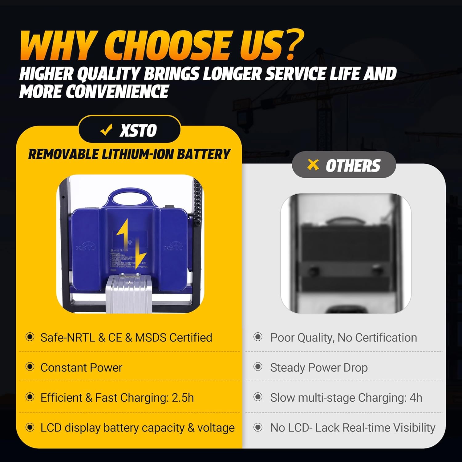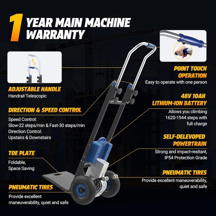 • LITHIUM-ION BATTERY POWERED: The ZW47250 electric hand truck dolly features a removable and rechargeable battery. It’s powerful and efficient, allowing it to climb 70 – 84 floors on a full charge, with plug-and-play design, auto-connection, an independent switch, and a battery level/voltage display. Powered by a 1200W brushless motor, its load capacity is up to550Lbs.