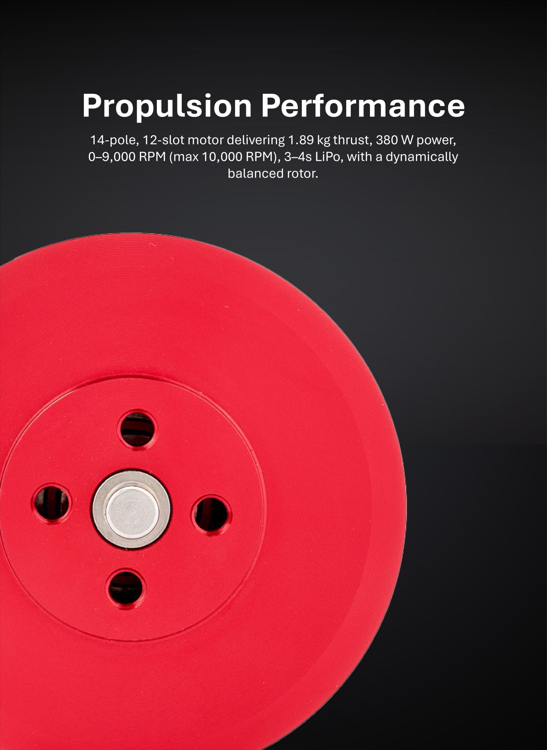 Featuring 14 magnetic poles and 12 stator slots, this motor offers a maximum thrust of 1.89kg, 380W of power, and a nominal operating speed of 0 to 9,000 RPM, with a maximum speed of 10,000 RPM. It also features a dynamically balanced rotor and a rated voltage of 3-4s (LiPo).