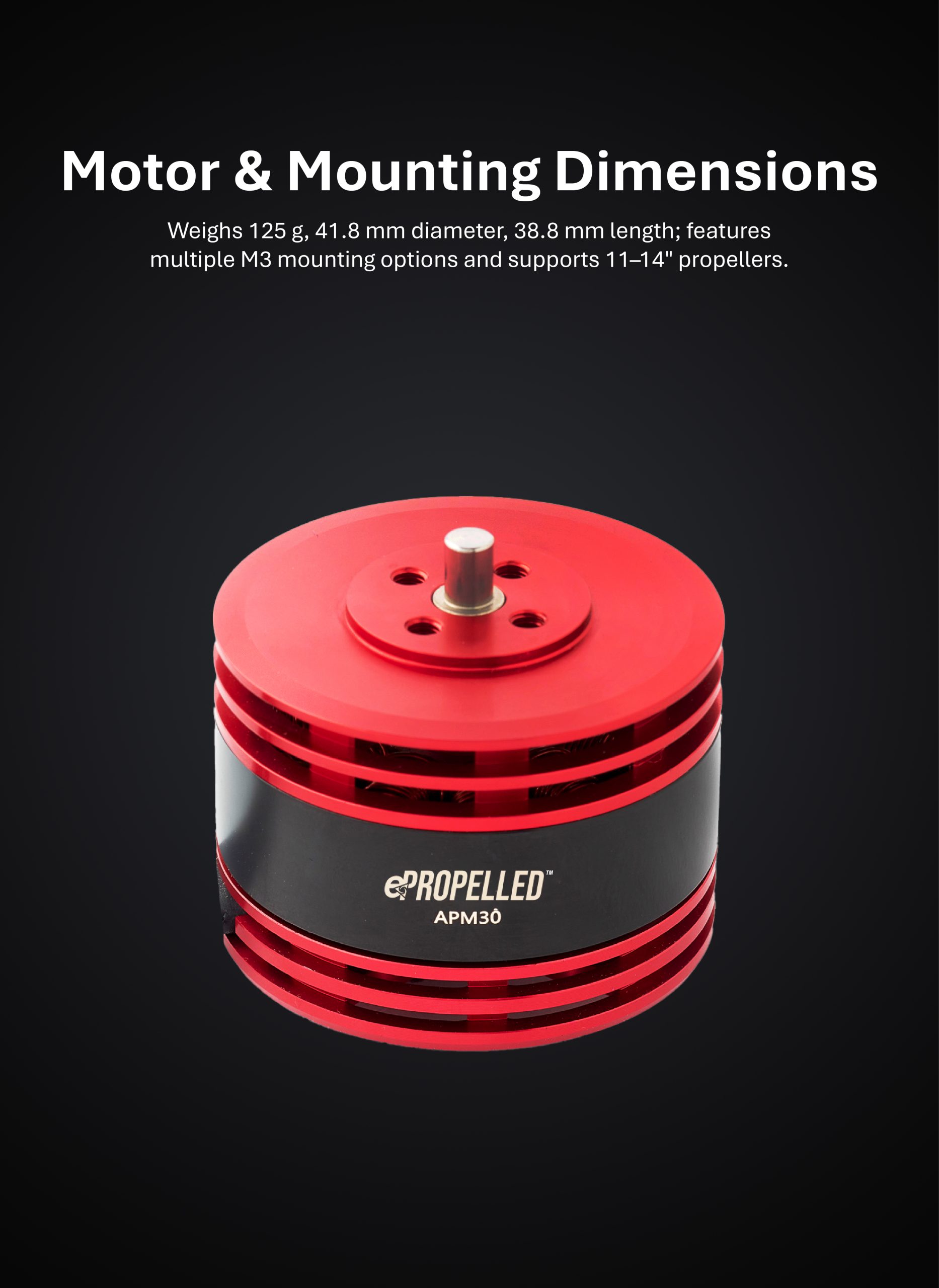 The ePropelled APM 3510-Kv700 Sparrow Series motor is a high-performance, brushless electric motor designed for demanding applications requiring both power and compactness. 380W Drone Motor Replacement, Air Propulsion Motors for Drones, 3-4s LiPo, Fits 11-14″ Propellers, IP45 Rating.
