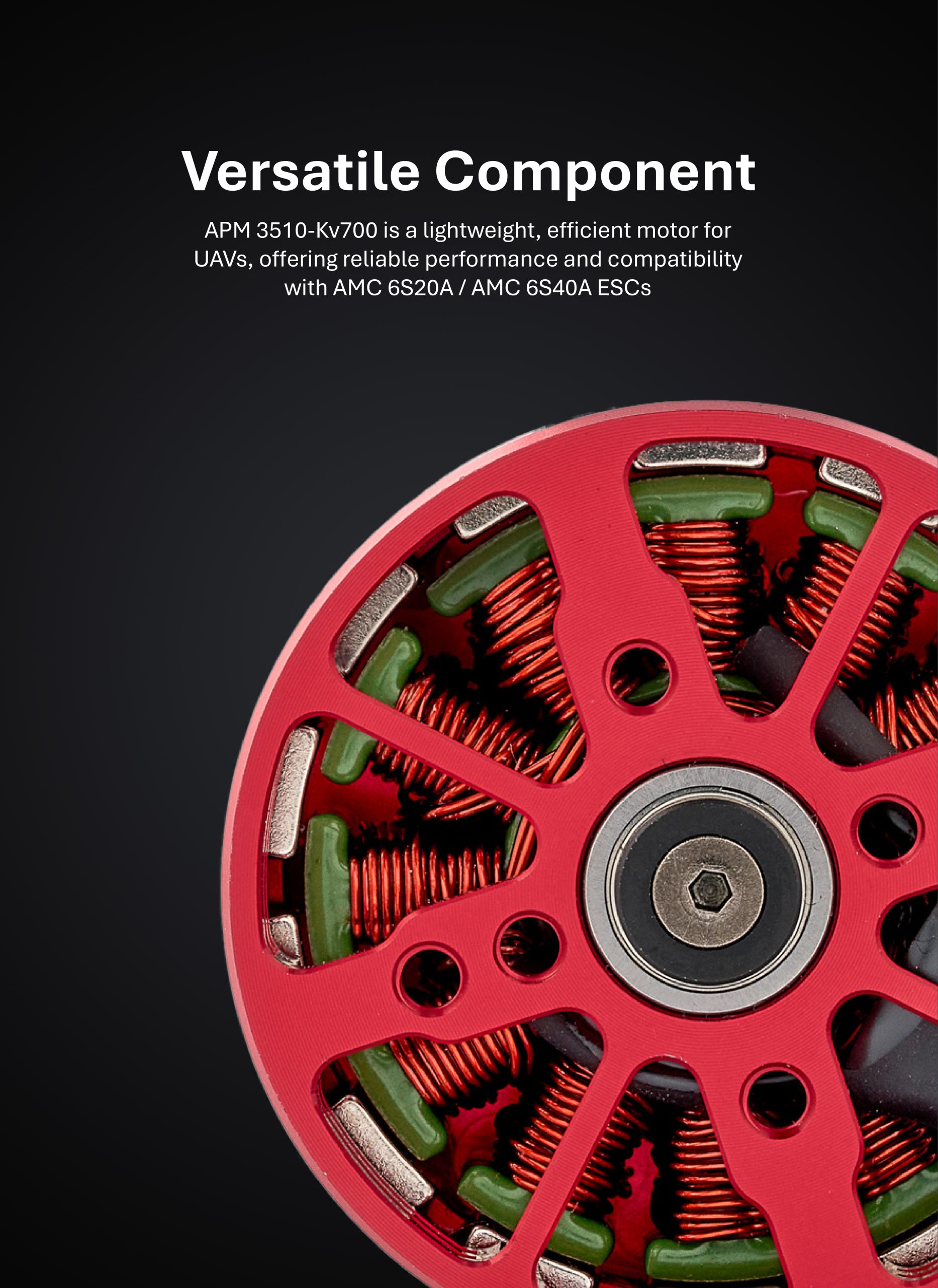 Suited for new UAV designs and easy motor replacements, the APM 3510-Kv700 is an energy-efficient, light-to-medium-duty component that offers optimized performance across most mainstream drone uses; compatible with AMC 6S20A and AMC 6S40A ESC series.