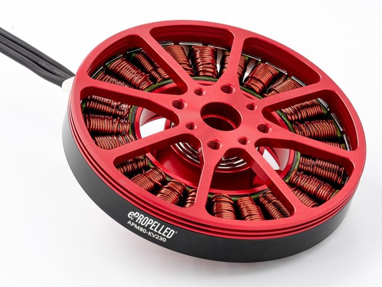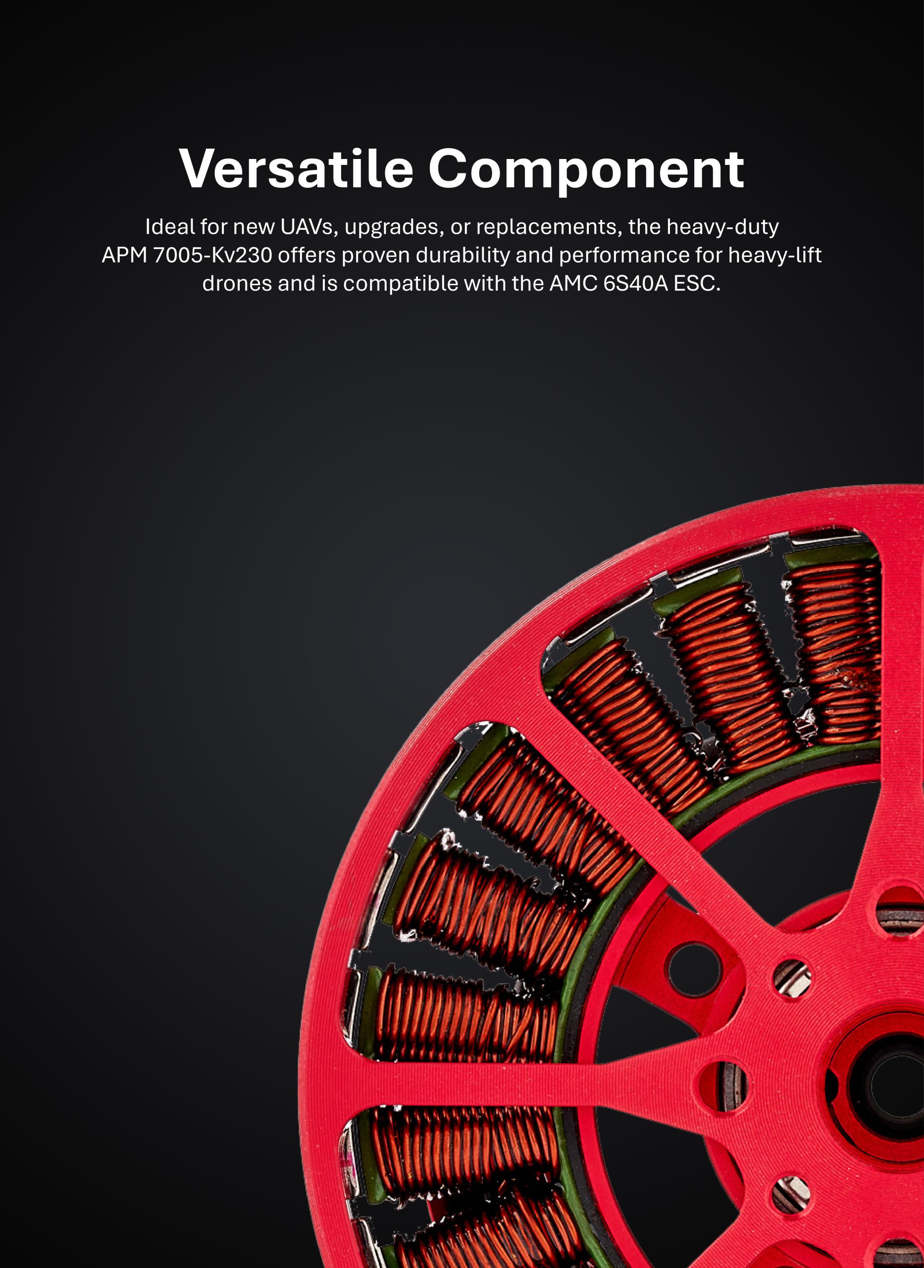 For new UAV designs, propulsion upgrades, or motor replacements, the heavy-duty APM 7005-Kv230 boasts a record of durability, reliability, and easily optimized performance across mainstream heavy-lift drone applications; it is compatible with the AMC 6S40A ESC.