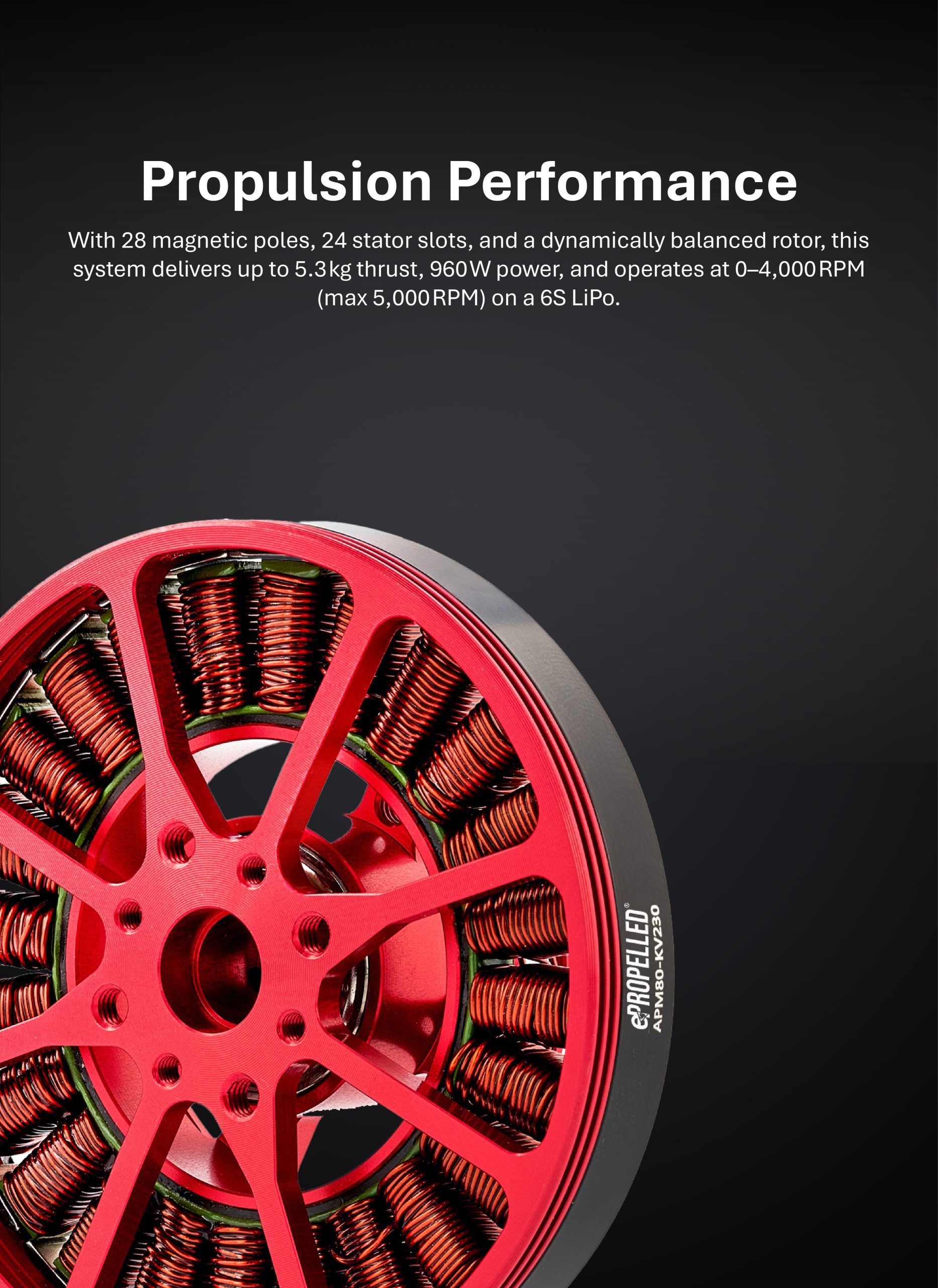 Featuring 28 magnetic poles and 24 stator slots, a maximum thrust of 5.3kg, 960W of power, a nominal operating speed of 0 to 4,000 RPM with a max speed of 5,000 RPM, a dynamically balanced rotor, and a rated voltage of 6s (LiPo)