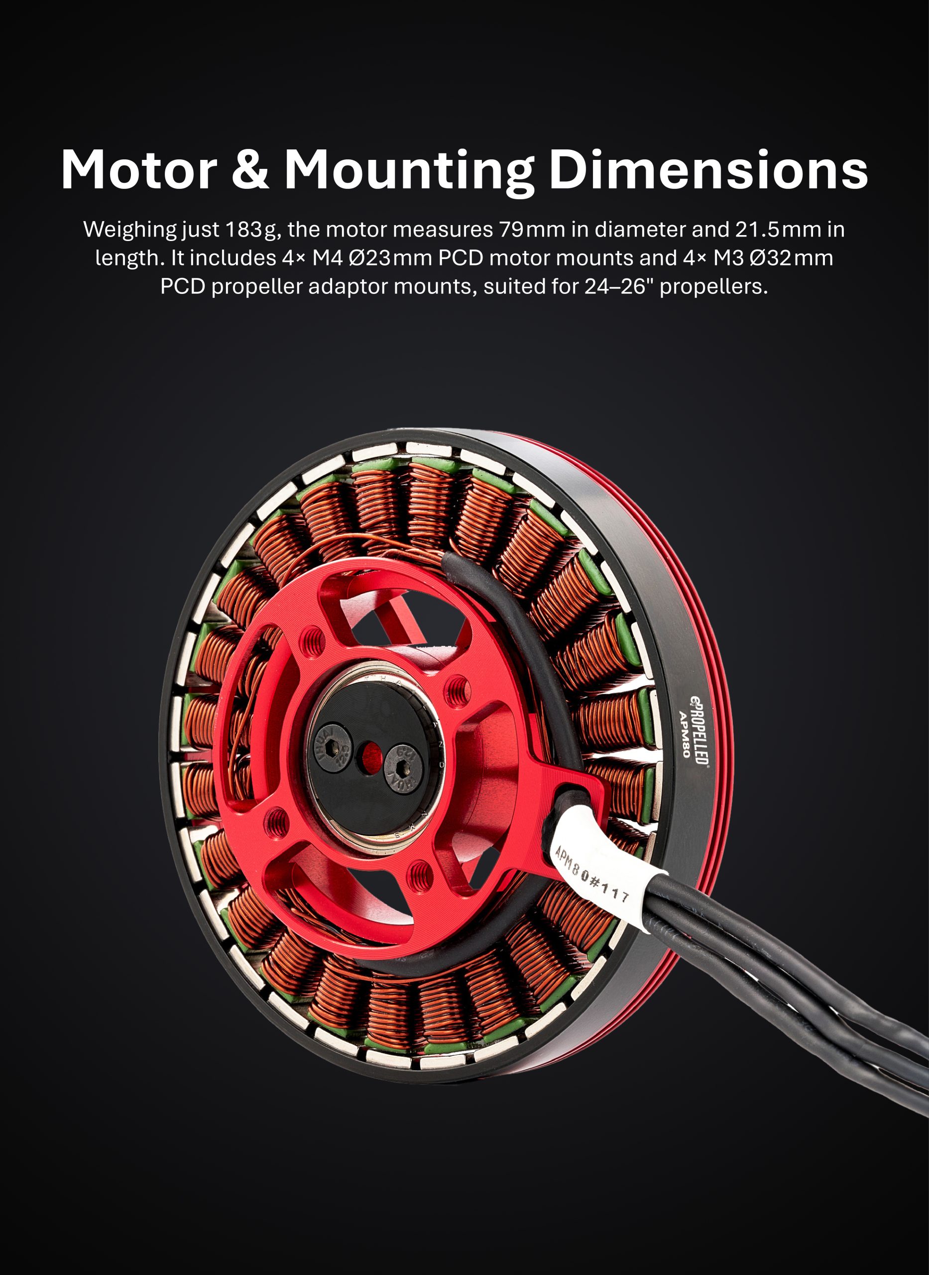 The motor weighs only 183g, with a diameter of 79mm and a length of 21.5mm. It features 4x M4 Ø23mm PCD motor mounting holes and 4x M3 Ø32mm PCD propeller adaptor mounting holes, with a recommended propeller size of 24-26 inches.