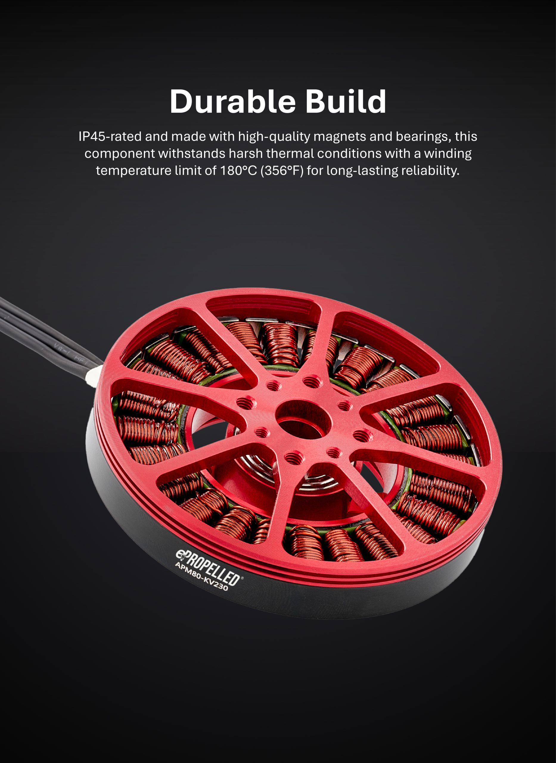 A reliable, IP45-rated component built with high-performing materials, including permanent magnets and bearings, for a longer life span and to endure harsh thermal environments, with a winding operating temperature limit of 180°C/356°F.