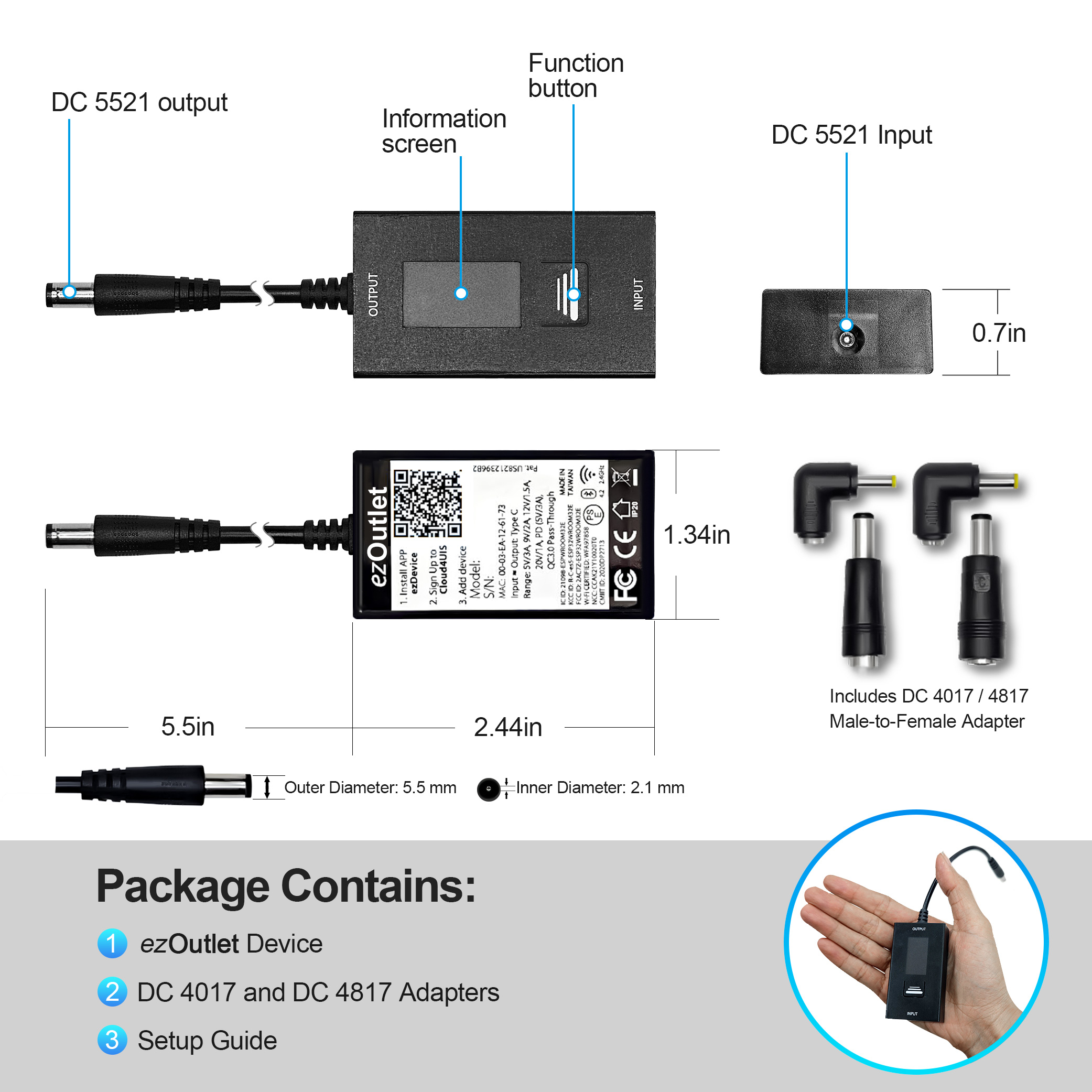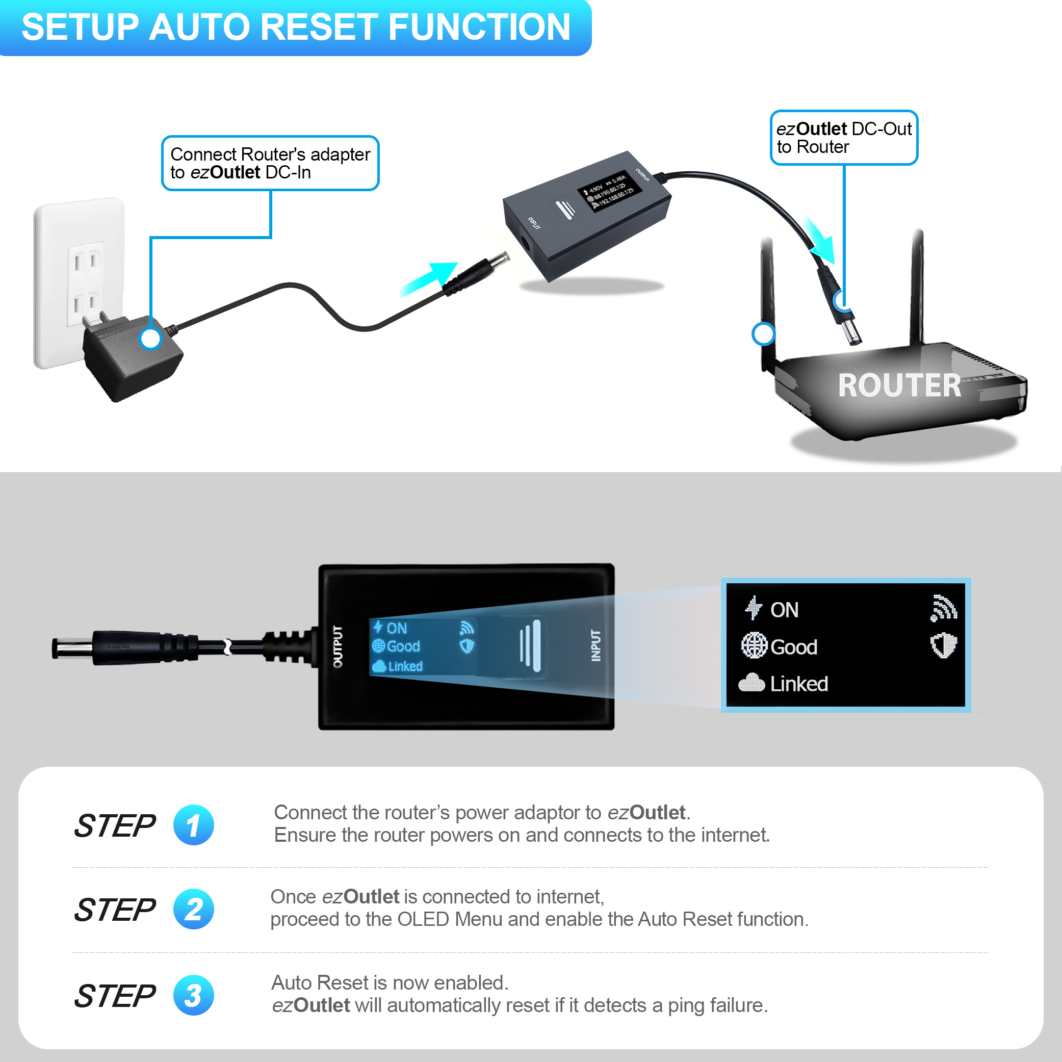 • KEY FEATURES & FUNCTIONALITY: Automatically checks Internet Connectivity and resets the power device when the connection is lost. Plugs Directly Into Your Existing Device’s Power Input (Supports DC5521, DC4017, DC4817). Set a schedule to Power On, Off, or Reset Your Device. Integrated Power Monitoring. OLED Display for Information & Controls.