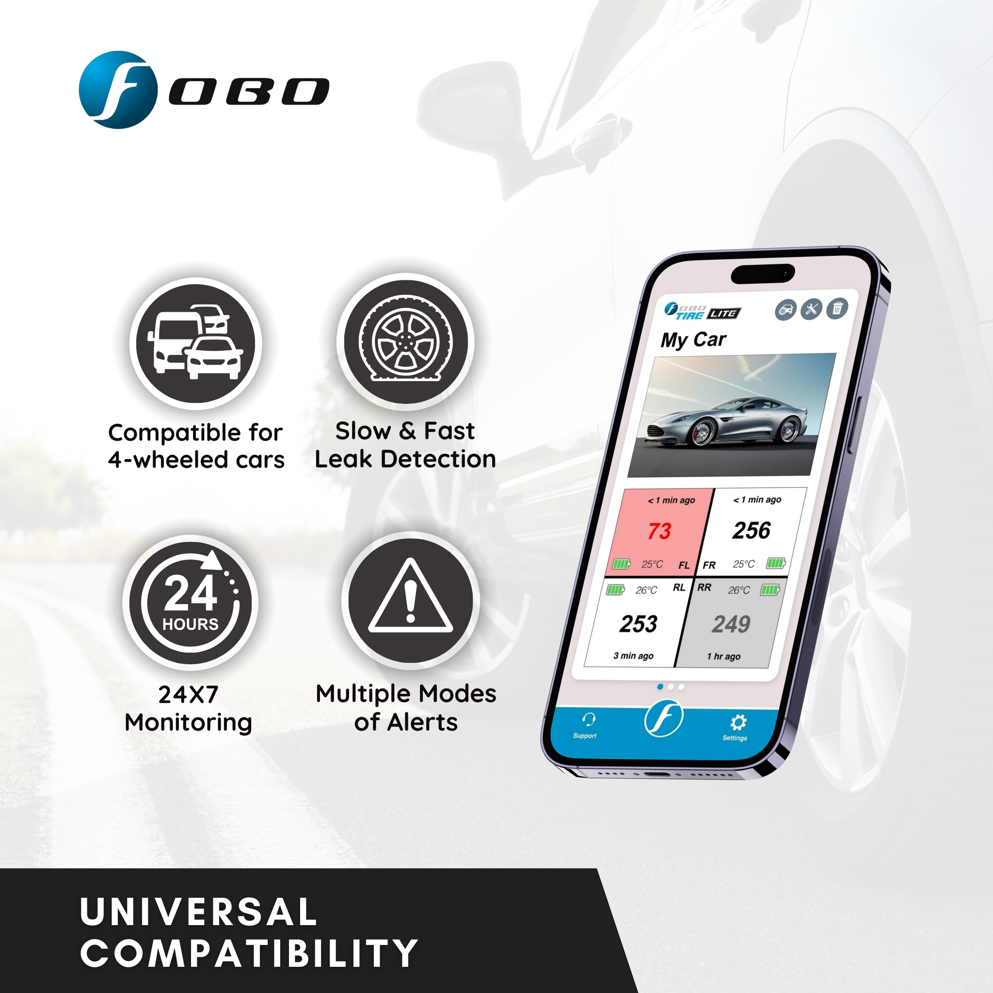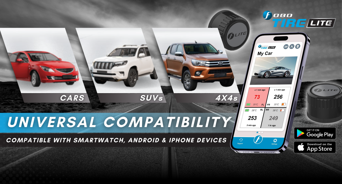 With FOBO TIRE LITE, you can drive with confidence, knowing that your tire Pressure and Temperature are being constantly monitored and that potential issues are flagged before they become serious problems. Trust in FOBO’s advanced technology to ensure every journey is a safe one, and experience peace of mind with every mile you travel.
