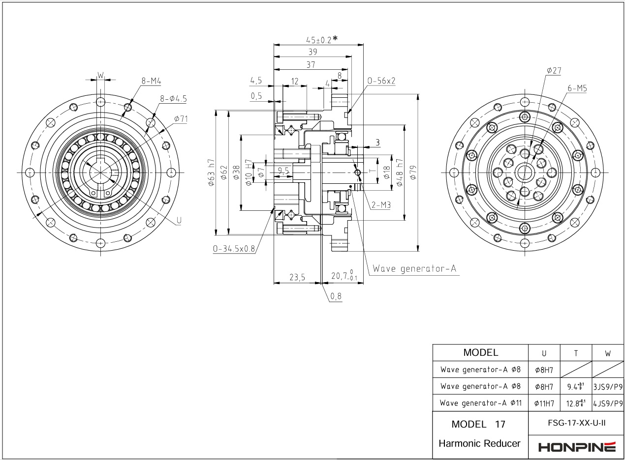 The FSG-II series strain wave gear utilizes a cross-slider coupling mechanism for its wave generator. The camshaft bore dimensions can be customized to accommodate specific motor models. The input shaft directly engages with the wave generator’s inner bore through a keyed connection. This configuration is typically implemented with the circular spline fixed at the base and the flexspline serving as the output end.