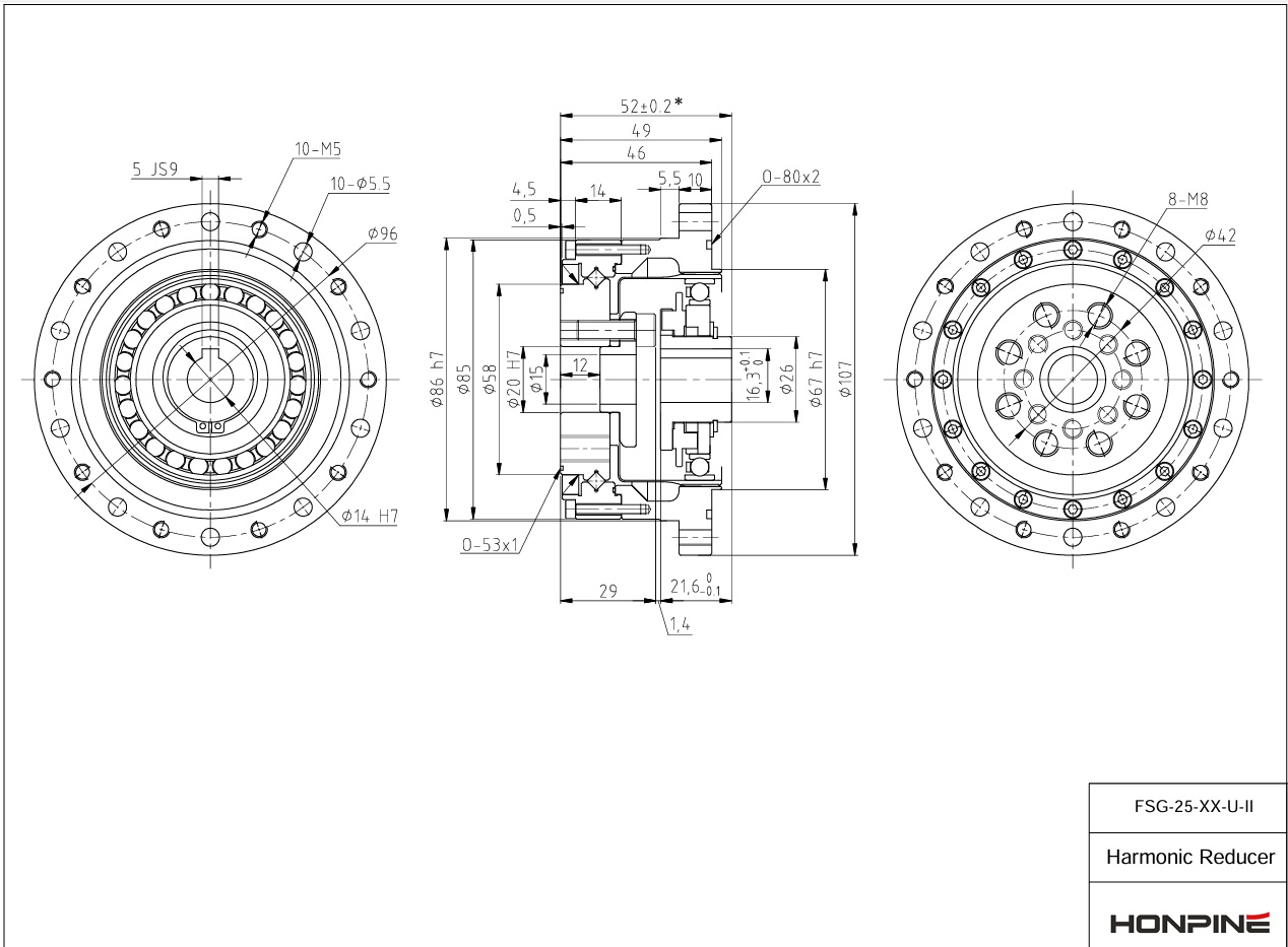 The FSG-II series strain wave gearbox utilizes a cross-slider coupling mechanism for its wave generator. The camshaft bore dimensions can be customized to accommodate specific motor models. The input shaft directly engages with the wave generator’s inner bore through a keyed connection. This configuration is typically implemented with the circular spline fixed at the base and the flexspline serving as the output end.