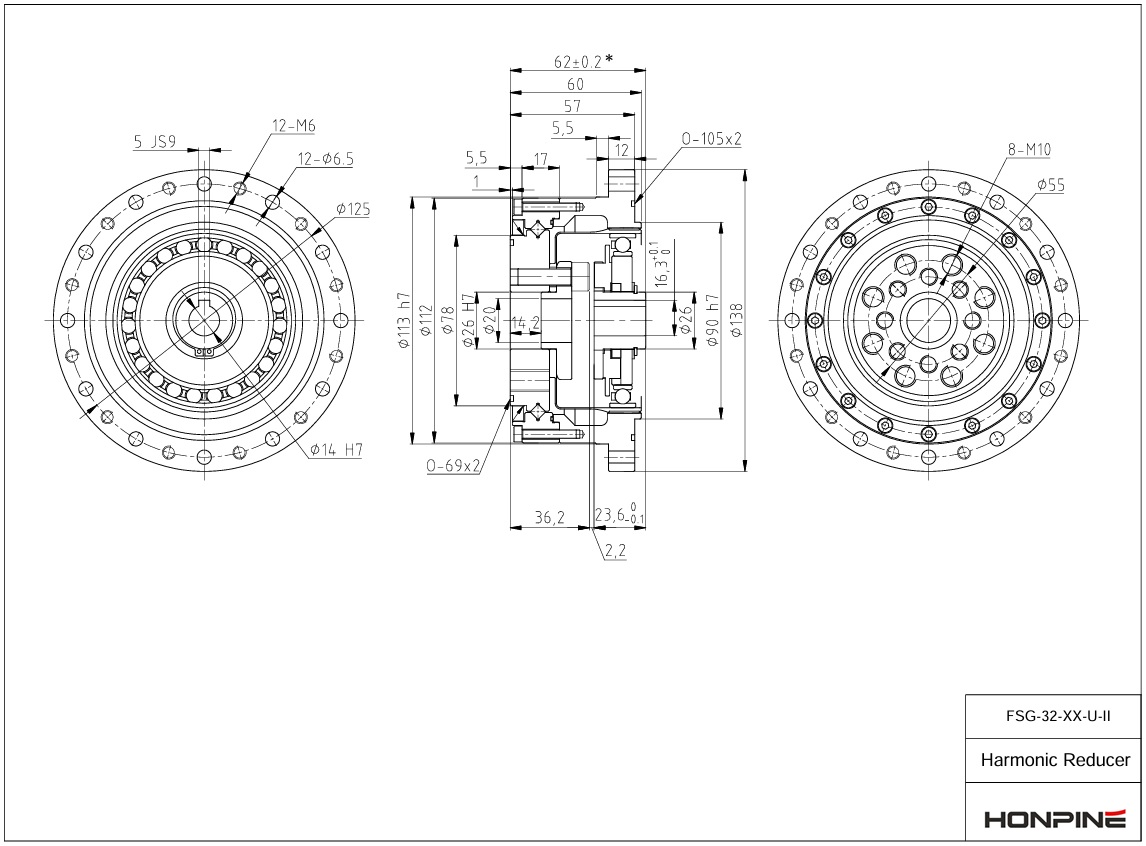 The FSG-II series strain wave gearbox utilizes a cross-slider coupling mechanism for its wave generator. The camshaft bore dimensions can be customized to accommodate specific motor models. The input shaft directly engages with the wave generator’s inner bore through a keyed connection. This configuration is typically implemented with the circular spline fixed at the base and the flexspline serving as the output end.