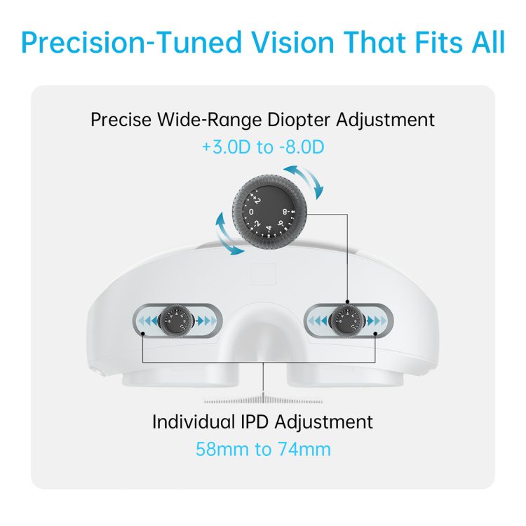 +2.0D to -8.0D Diopter Adjustment, No Glasses Needed: Enables smooth, individual adjustment for each eye. Spanning +2.0D to -8.0D, it accommodates a wide range of prescriptions, ensuring sharp and comfortable viewing without the need for glasses.