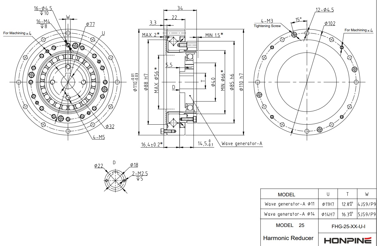 The FHG-I series harmonic gear reducer strain wave gear box features an integrated cam structure for its wave generator. The size of the camshaft hole can be adjusted according to the customer’s motor model, with the input shaft directly fitting into the inner bore of the wave generator and connected via a flat key. It incorporates a built-in high-rigidity cross roller bearing (main bearing). Generally, it is used with the rigid wheel end fixed and the flexspline end output, or with the flexspline fixed and the rigid wheel end output as the connection method.