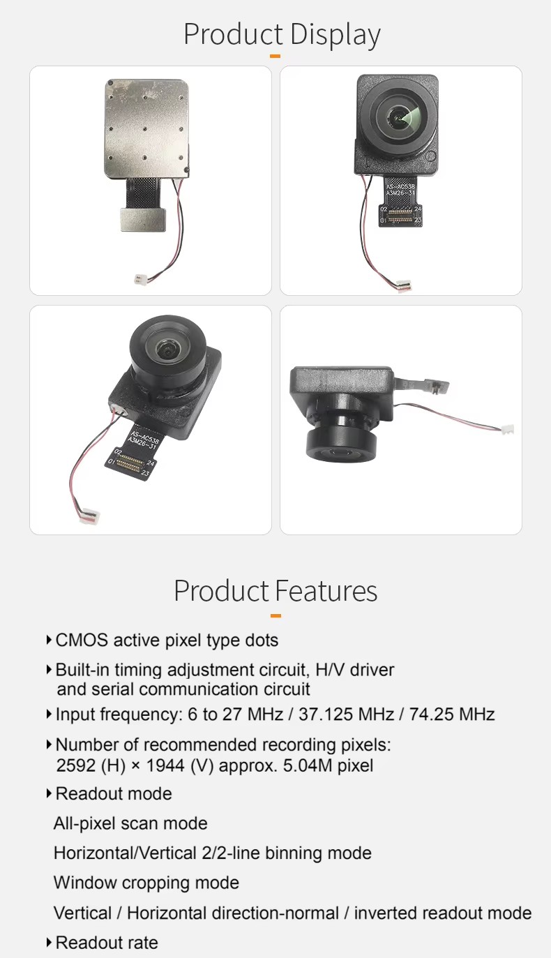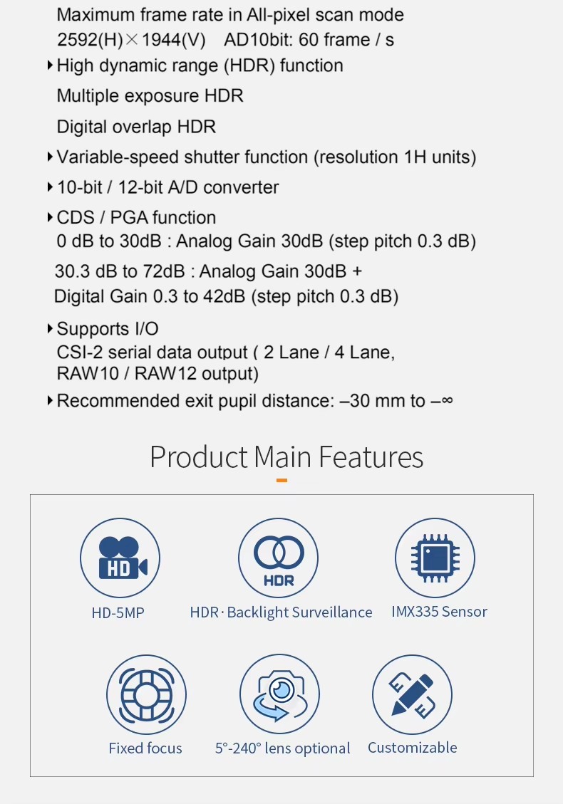 - Frame rate: 2592 (H) x1944 (V): 60 fps