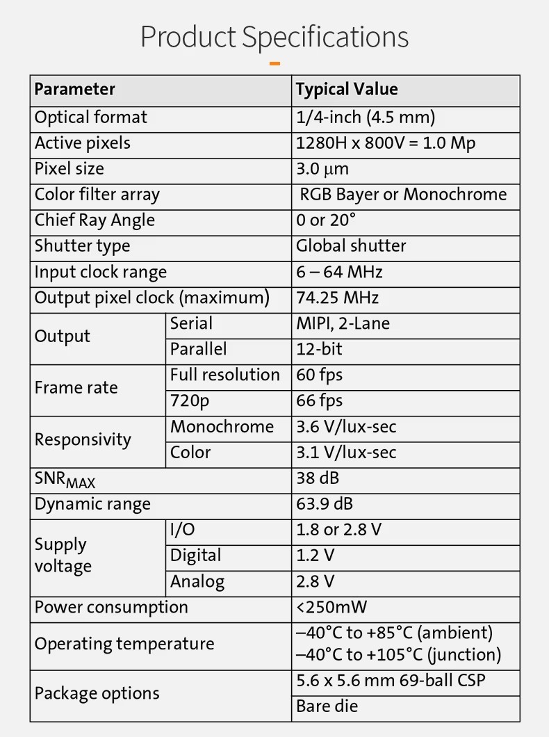 - Active pixels: 1MP 1280Hx800V