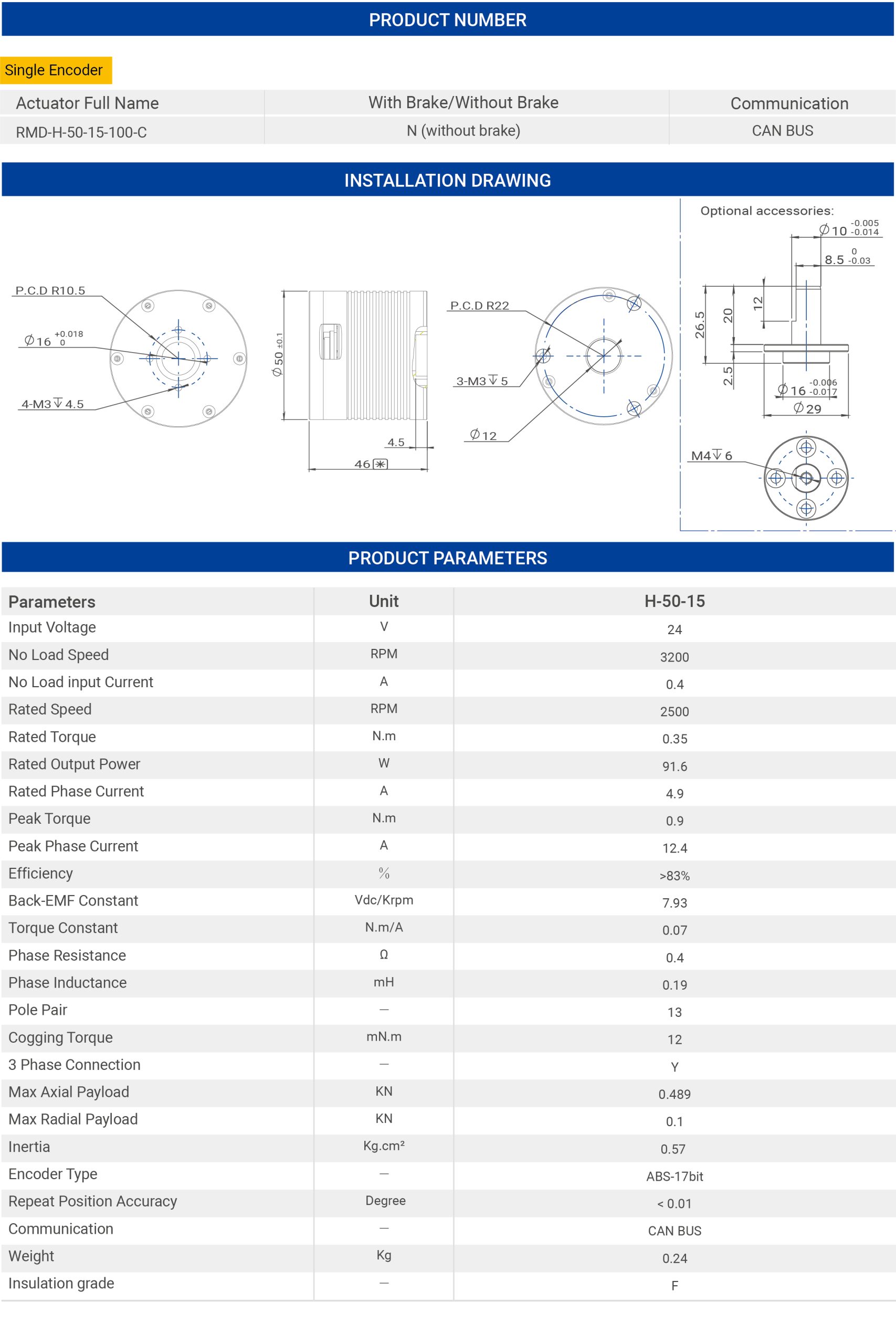 High-Speed Motor All-in-One Direct Drive Module with High Precision Drive Integration RMD-H-50 CAN