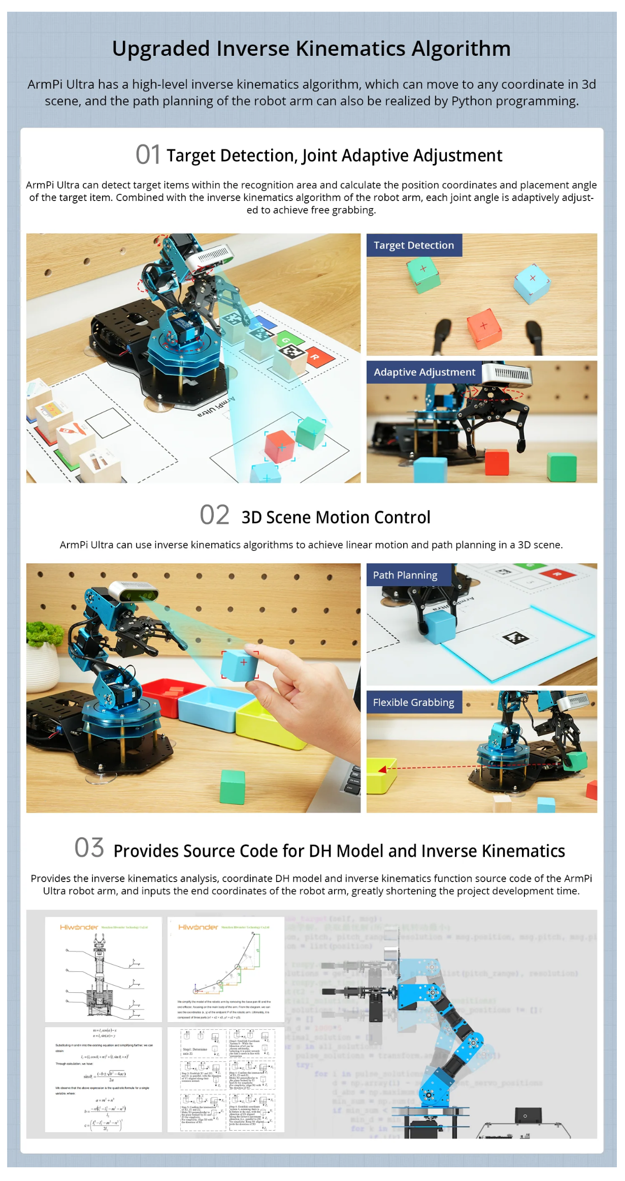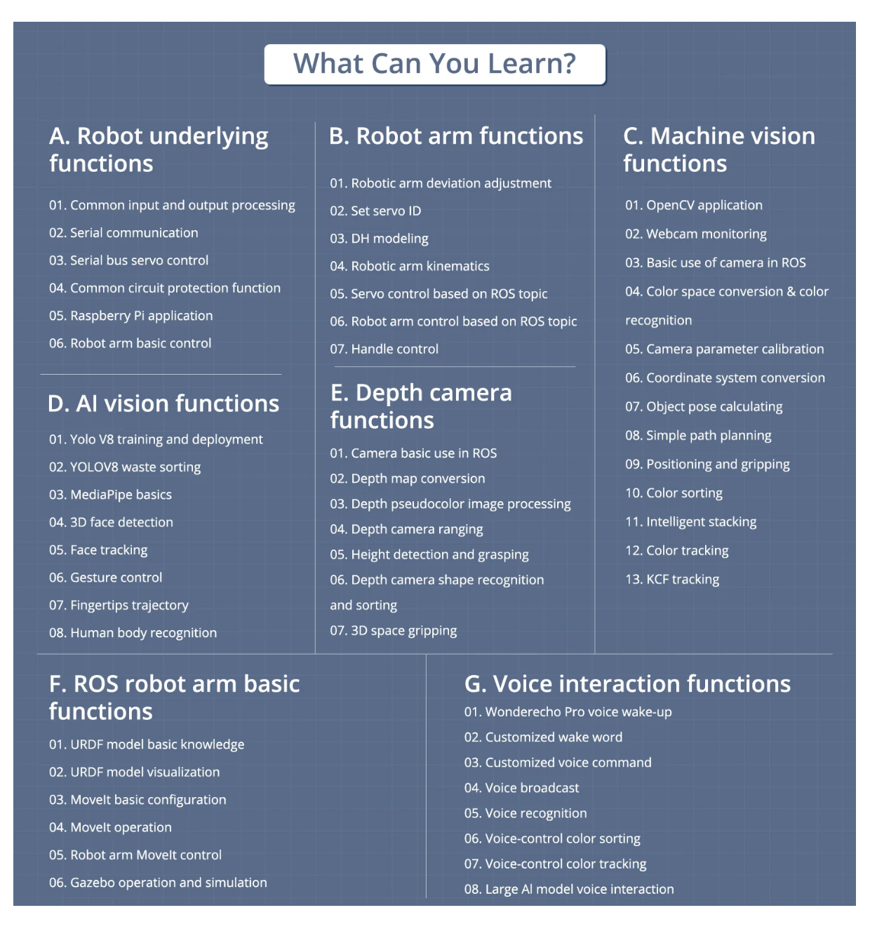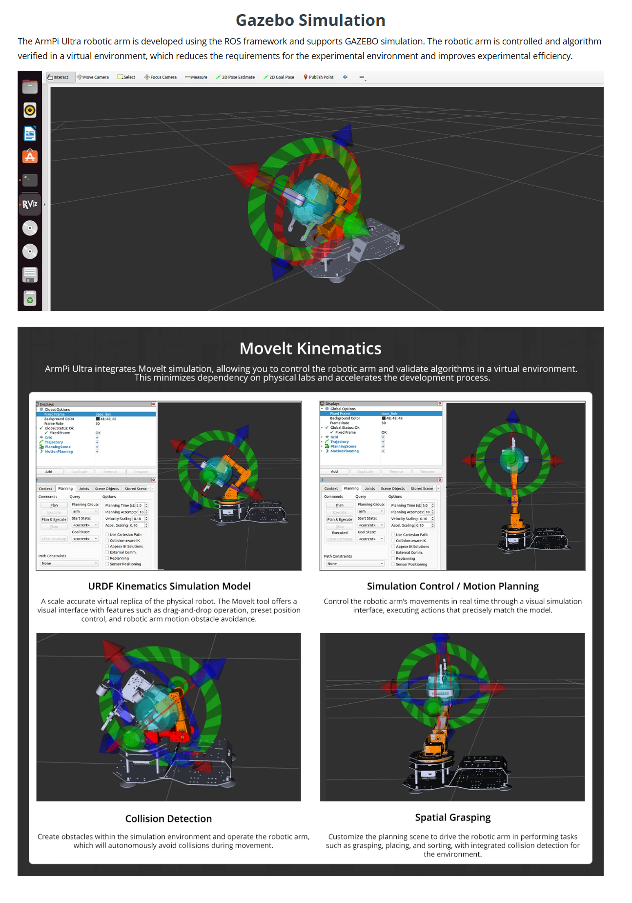• Advanced Technologies & Comprehensive Tutorials: With ArmPi Ultra, you will master a broad range of cutting-edge technologies, including ROS development, 3D depth vision, OpenCV, YOLOv8, MediaPipe, Large AI models, robotic inverse kinematics, MoveIt, Gazebo simulation, and voice interaction. We provide learning materials and video tutorials to guide you step by step, ensuring you can confidently develop your AI-powered robotic arm.