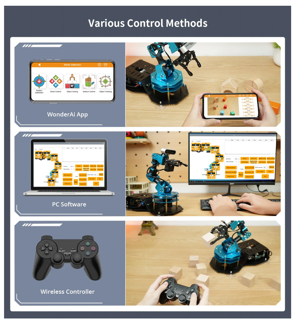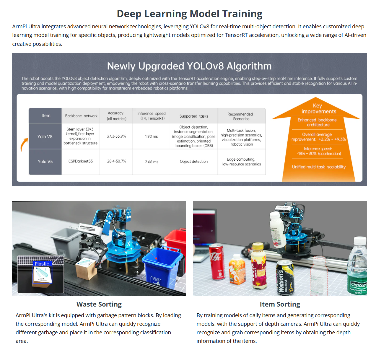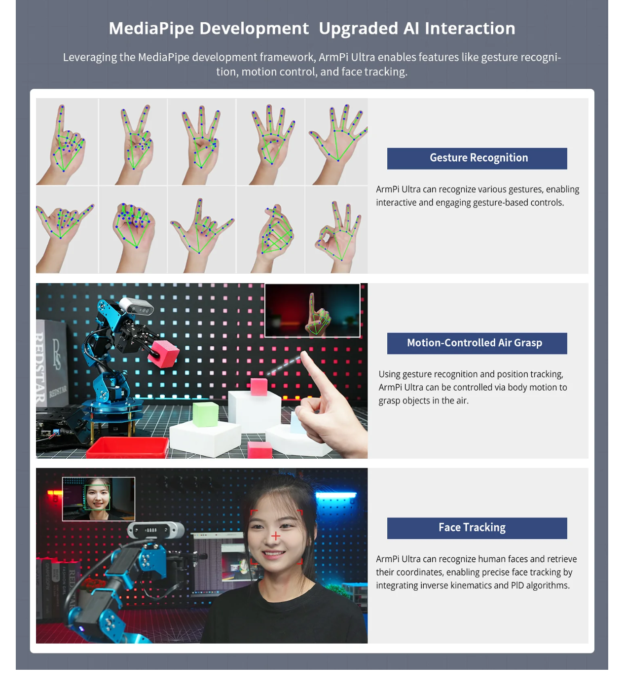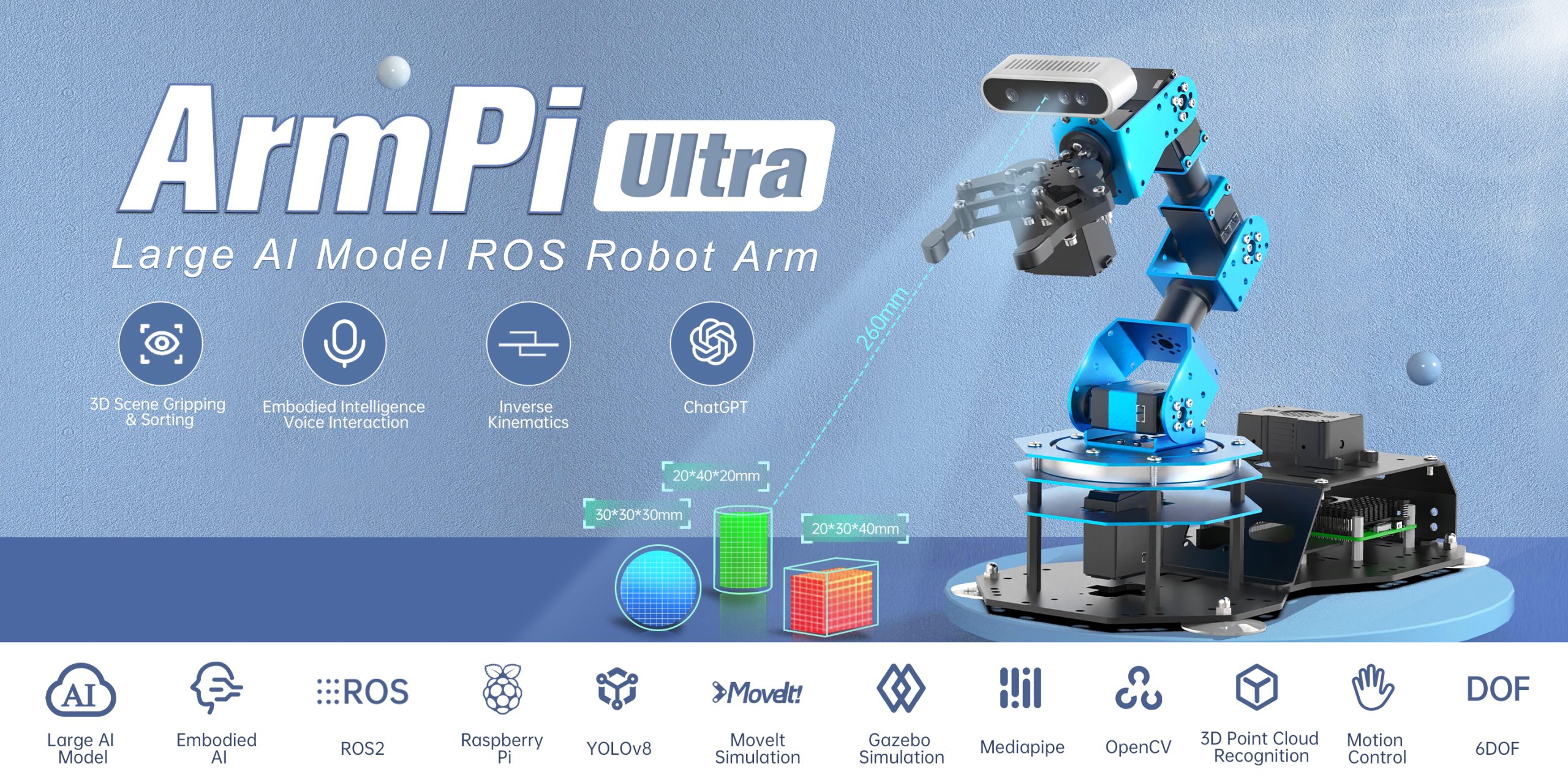 • Advanced Technologies & Comprehensive Tutorials: With ArmPi Ultra, you will master a broad range of cutting-edge technologies, including ROS development, 3D depth vision, OpenCV, YOLOv8, MediaPipe, Large AI models, robotic inverse kinematics, MoveIt, Gazebo simulation, and voice interaction. We provide learning materials and video tutorials to guide you step by step, ensuring you can confidently develop your AI-powered robotic arm.