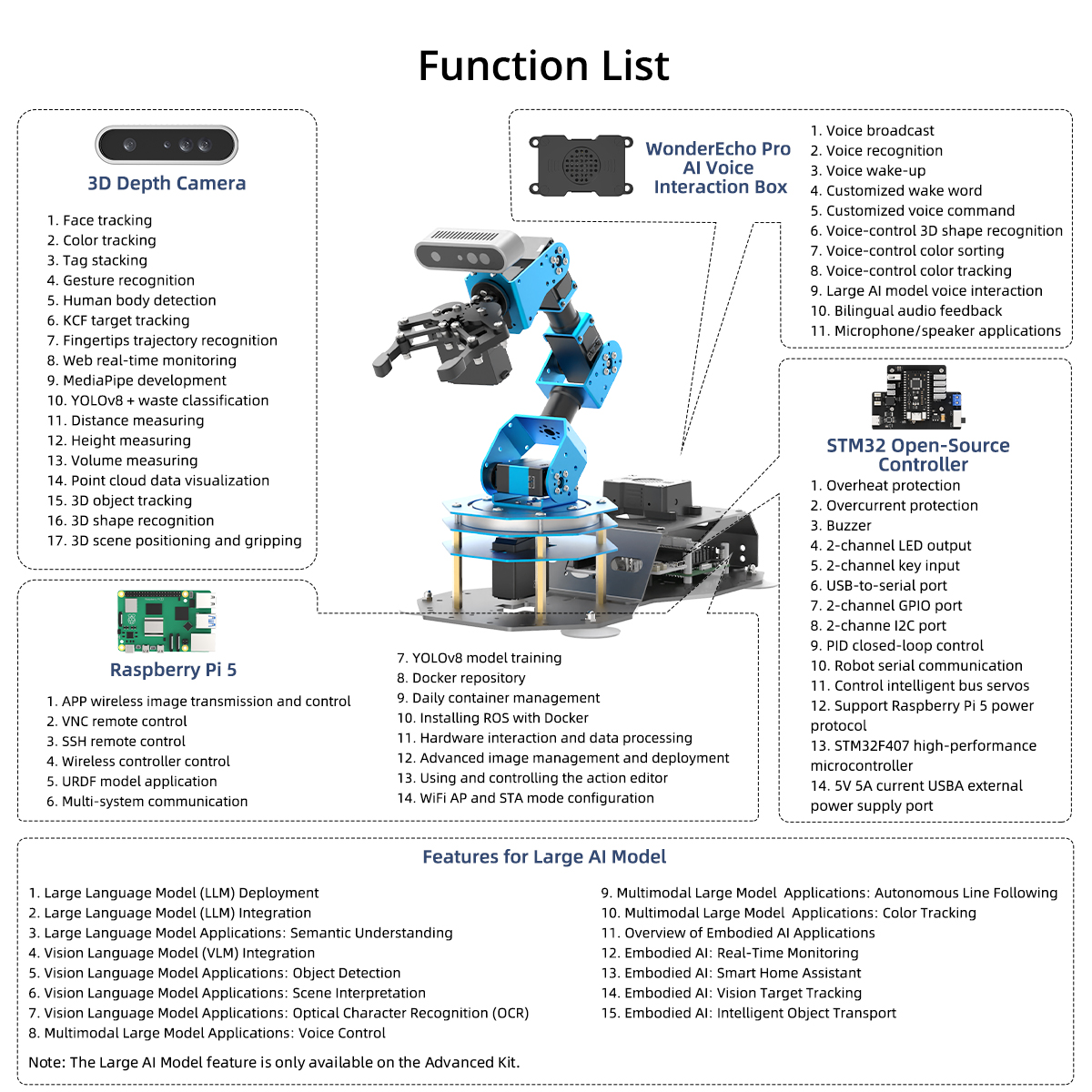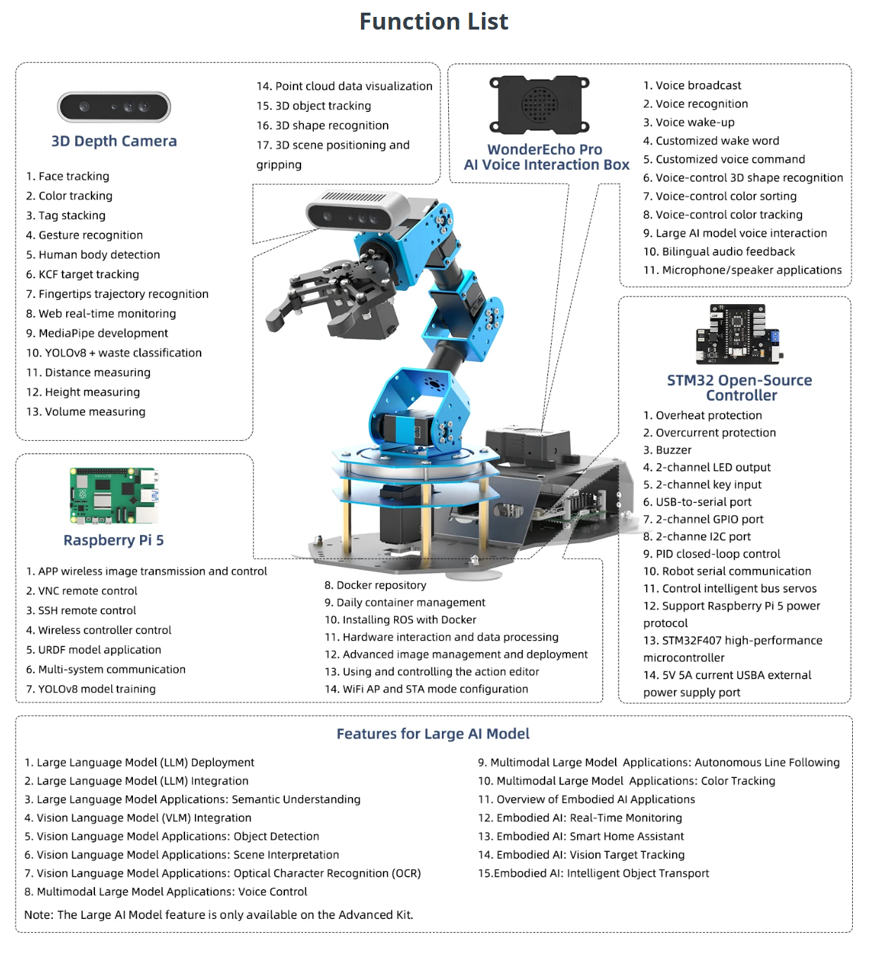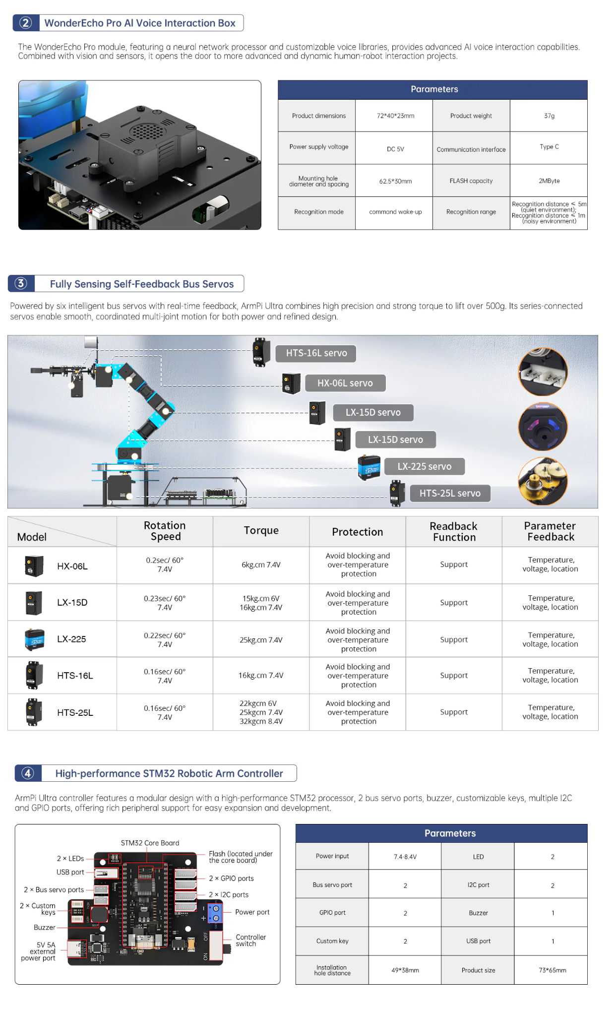• High-Performance AI Robotics: ArmPi Ultra features six intelligent serial bus servos with a torque of 25KG. The robot is equipped with a 3D depth camera, a WonderEcho AI voice box, and integrates Multimodal Large AI Models, enabling a wide variety of applications, such as 3D spatial grabbing, target tracking, object sorting, scene understanding, and voice control.
